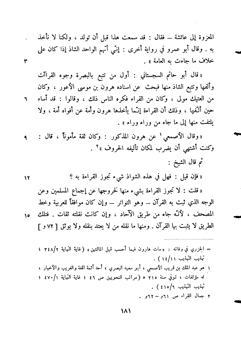 "قال أبو حاتم السجستاني: أول من تتبع بالبصرة وجوه القراءات وألفها وتتبع الشاذ منها فبحث عن إسناده هارون بن موسى الأعور، وكان من العتيك مولى، وكان من القراء فكره الناس ذلك، وقالوا: قد أساء حين ألفها، وذلك أن القراءة إنما يأخذها هارون وأمة عن أفواه الأمة، ولا يلتفت منها إلى ما جاء من وراء وراء".