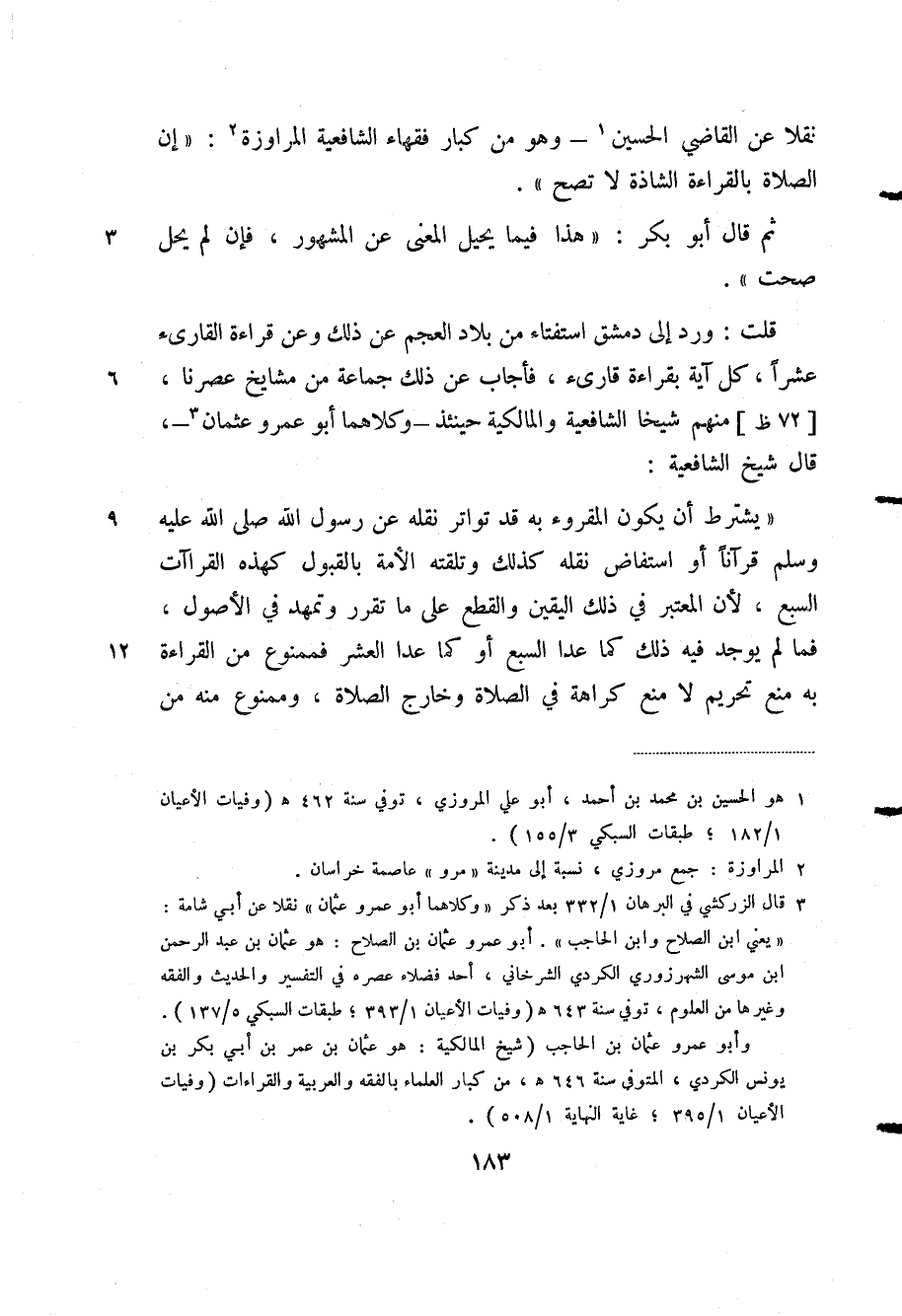 (¬3) قال الزركشي في البرهان 1/ 332، بعد ذكر "وكلاهما أبو عمرو عثمان" نقلا عن أبي شامة: "يعني ابن الصلاح وابن الحاجب". أبو عمرو عثمان بن الصلاح: هو عثمان بن عبد الرحمن بن موسى الشهرزوري الكردي الشرخاني، أحد فضلاء عصره في التفسير والحديث والفقه وغيرها من العلوم، توفي سنة 643هـ "وفيات الأعيان 1/ 393، طبقات السبكي 5/ 137".