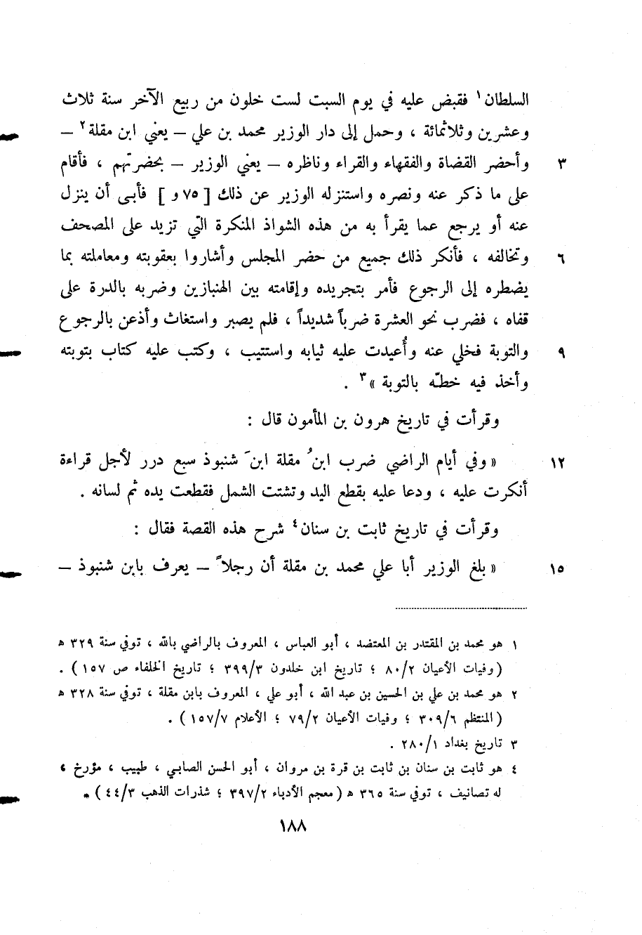 (¬4) هو ثابت بن سنان بن ثابت بن قرة بن مروان، أبو الحسن الصابي، طبيب، مؤرخ، له تصانيف، توفي سنة 365هـ "معجم الأدباء 2/ 397، شذرات الذهب 3/ 44".