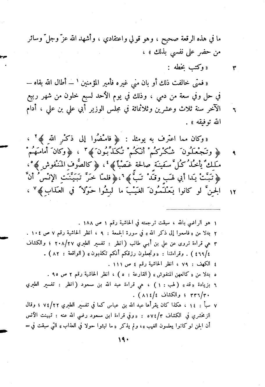 "وكان مما اعترف به يومئذ: "فامضوا إلى ذكر الله" (¬2) ، "وتجعلون شكركم أنكم تكذبون" (¬3) ، "وكان أمامهم ملك يأخذ كل سفينة صالحة غصبا" (¬4) ، "كالصوف المنفوش" (¬5) ، "تبت يدا أبي لهب وقد تب" (¬6) ، "فلما خر تبينت الإنس أن الجن لو كانوا يعلمون الغيب ما لبثوا حولا في العذاب" (¬7) ،