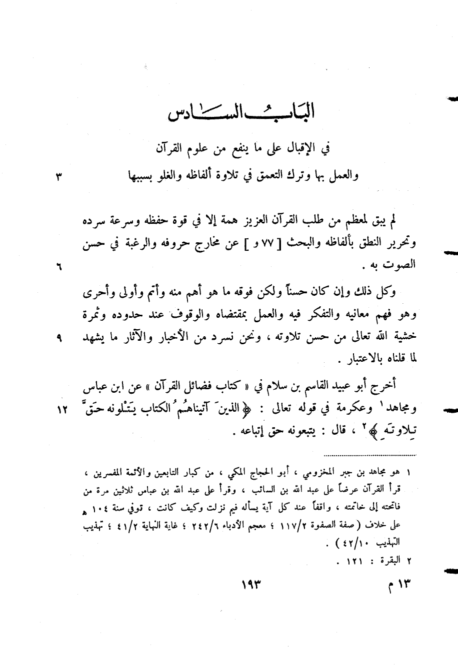 الباب السادس: في الإقبال على ما ينفع من علوم القرآن والعمل بها وترك التعمق في تلاوة ألفاظه والغلو بسببها
