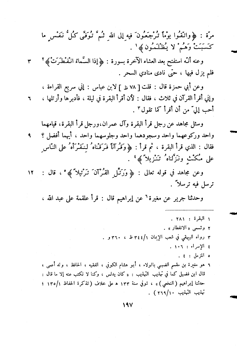 وعن أبي حمزة قال: قلت [78 ظ] لابن عباس: إني سريع القراءة، وإني أقرأ القرآن ثلاث، فقال: لأن أقرأ البقرة في ليلة، فأدبرها وأرتلها، أحب إلي من أن أقرأ كما تقول (¬3) .