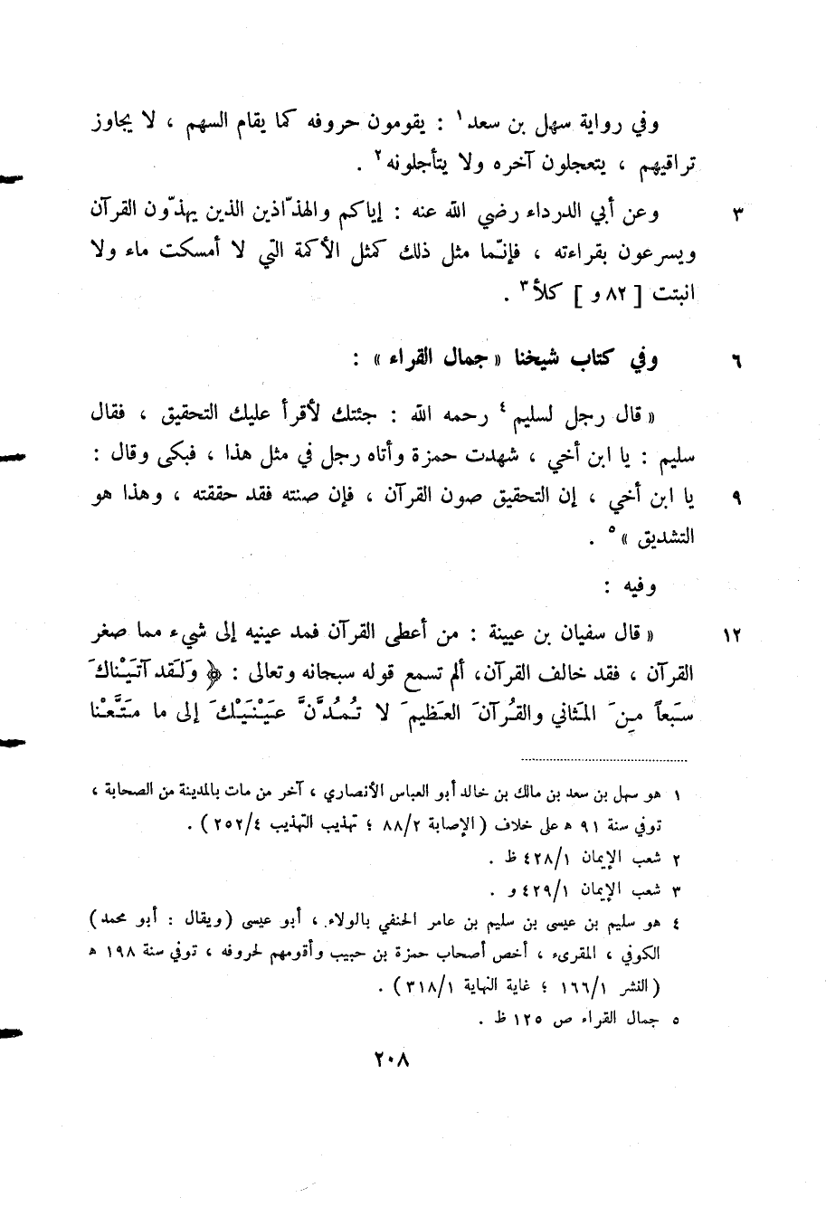 "قال رجل لسليم (¬4) رحمه الله: جئتك لأقرأ عليك التحقيق، فقال سليم: يابن أخي، شهدت حمزة وأتاه رجل في مثل هذا، فبكى وقال: يابن أخي، إن التحقيق صون القرآن، فإن صنته فقد حققته، وهذا هو التشديق" (¬5) .