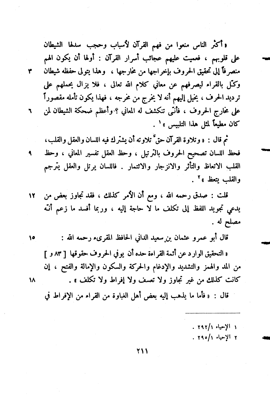 "أكثر الناس منعوا من فهم القرآن لأسباب وحجب سدلها الشيطان على قلوبهم، فعميت عليهم عجائب أسرار القرآن: أولها أن يكون الهم منصرفا إلى تحقيق الحروف بإخراجها من مخارجها، وهذا يتولى حفظه شيطان وكّل بالقراء ليصرفهم عن معاني كلام الله تعالى، فلا يزال يحملهم على ترديد الحرف، يخيل إليهم أنه لا يخرج من مخرجه، فهذا يكون تأمله مقصورا على مخارج الحروف، فأنى تنكشف له المعاني؟ وأعظم ضحكة الشيطان لمن كان مطيعا لمثل هذا التلبيس" (¬1) .