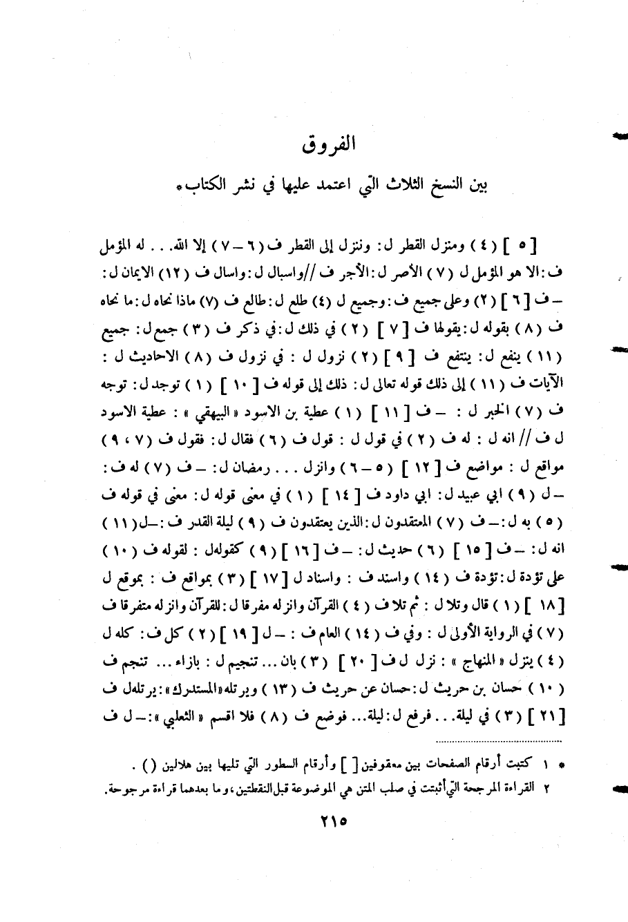 [5] "4" ومنزل القطر ل: وننزل إلى القطر ف "6-7" إلا الله ... له المؤمل ف: إلا هو المؤمل ل "7" الأصر ل: الأجرف// واسبال ل: واسال ف "12" الإيمان ل: ف [6] "2" وعلى جميع ف: وجميع ل "4" طلع ل: طالع ف [7] جمع ل: جميع "11" ينفع له: ينتفع ف [9] "2" نزول ل: في نزول ف "8" الأحاديث ل: الآيات ف "11" إلى ذلك قوله تعالى ل: ذلك إلى قوله ف [10] "1" توجد ل: توجه ف"7" الخبر ل: ف [11] "1" عطية بن الأسود "البيهقي": عطية الأسود ل ف// أنه ل: ف "2" في قول ل: قول ف "6" فقال ل: فقول ف "7، 9" مواقع له: مواضع ف [12] 5-6" وانزل ... رمضان ل: ف "7" له ف: ل 9" أبي عبيد ل: أبي داود ف [14] "1" في معنى قوله ل: معنى في قوله ف "5" به ل: ف "7" المعتقدون ل: الذين يعتقدون ف "9" ليلة القرد ف: ل "11" أنه ل: ف [15] "6" حديث ل: ف [16] "9" كقوله ل: لقوله ف "10" على تؤد له: تؤده في "14" واسند ف: واسناد ل [17] "3" بمواقع ف: بموقع ل [18] "1" قال وتلال: ثم تلاف "4" القرآن وانزله مفرقا ل: للقرآن وانزله متفرقا ف "7" في الرواية الأولى ل: وفي ف "14" العام في: ل [19] "2" كل في: كله ل "4" ينزل "المنهاج": نزل ل ف [20] بان ... تنجيم ل: بازاء ... تنجم ف "10" حسان بن حريث ل: حسان عن حريث ف "13" ويرتله "المستدرك": يرتله ل ف [21] "3" في ليلة ... فرفع ل: ليلة ... فوضع ف "8" فلا أقسم "الثعلبي": ل ف