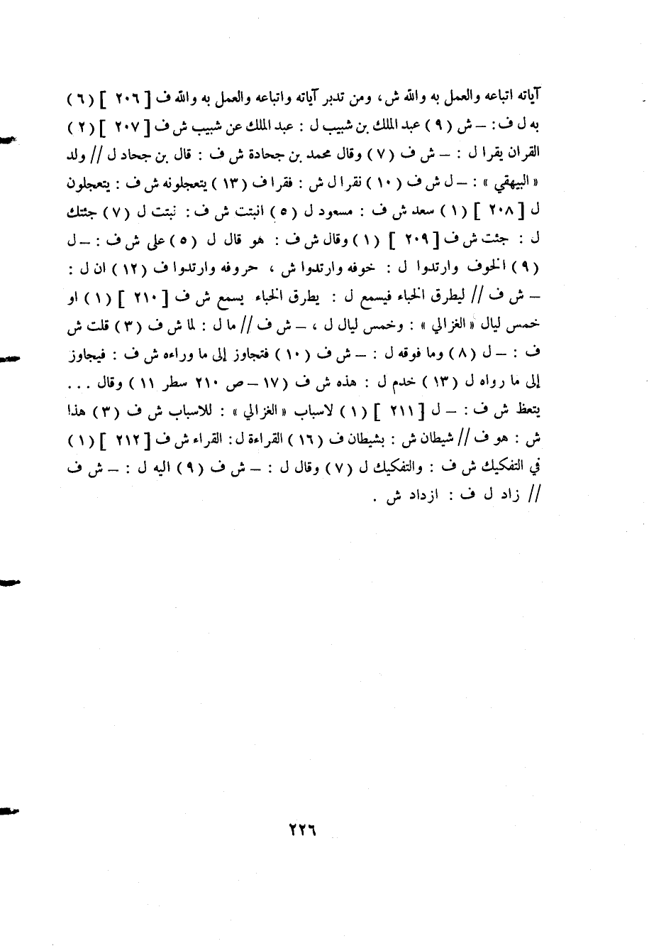آياته اتباعه والعمل به والله ش، ومن تدبر آياته واتباعه والعمل به والله ف [206] "6" به ل ف: ش "9" عبد الملك بن شبيب ل: عبد الملك عن شبيب ش ف [207] "2" القرآن يقرا ل: ش ف "7" وقال محمد بن جحادة ش ف: قال بن جحاد ل// ولد "البيهقي": ل ش ف "10" نقرا ل ش: فقرا ف "13" يتعجلونه ش ف: يتعجلون ل [208] "1" سعد ش ف: مسعود ل "5" انبتت ش ف: نبتت ل "7" جئتك ل: جئت ش ف [209] "1" وقال ش ف: هو قال ل "5" على ش ف: ل "9" الخوف وارتدوا ل: خوفه وارتدوا ش، حروفه وارتدوا ف "12" أن ل: ش ف// ليطرق البخاء فيمسعل: يطرق الخباء يسمع ش ف [210] "1" أو خمس ليال "الغزالي": وخمس ليال ل، ش ف/م ما ل: لما ش ف "3" قلت ش ف: ل "8" وما فوقه له: ش ف "10" فتجاوز إلى ما وراءه ش ف: فيجاوز إلى ما رواه ل "13" خدمل: هذه ش ف "17-ص 210سطر 11" وقال ... يتعظ ش ف: ل [211] "1" لاسباب "الغزالي": للاسباب ش ف "3" هذا ش: هو ف// شيطان ش: بشيطان ف "16" القراءة ل: القراء ش ف [212] "1" في التفكيك ش ف: والتفكيك ل "7" وقال ل: ش ف "9" إليه ل: ش ف// زاد ل ف: ازداد ش.