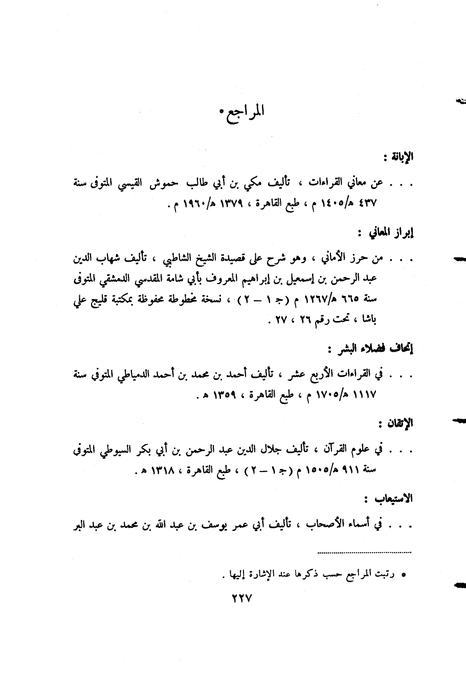 - إتحاف فضلاء البشر: في القراءات الأربع عشر، تأليف أحمد بن محمد بن أحمد الدمياطي المتوفى سنة 1117هـ/ 1705م، طبع القاهرة، 1359هـ.