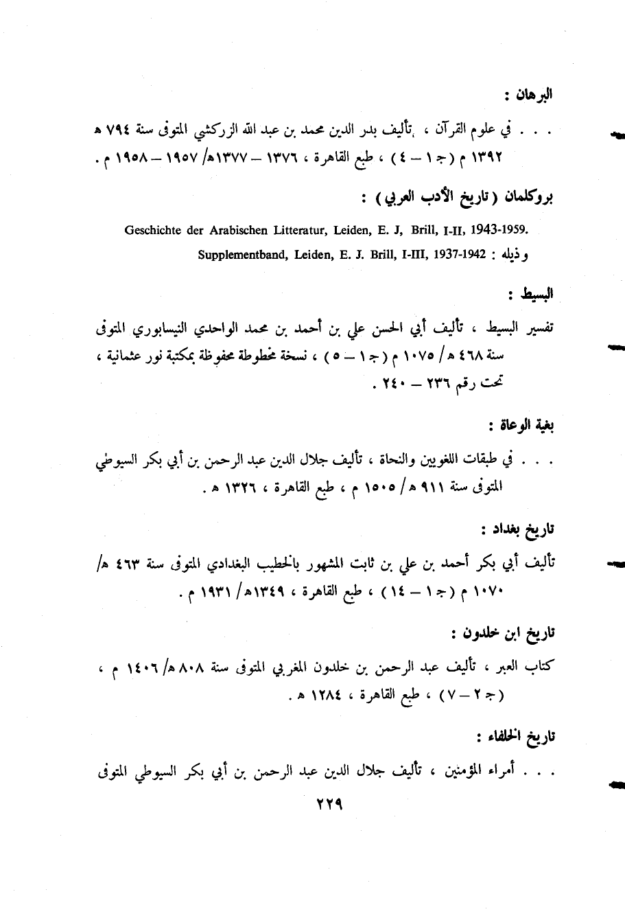 - بغية الوعاة: في طبقات اللغويين والنحاة، تأليف جلال الدين عبد الرحمن بن أبي بكر السيوطي المتوفى سنة 911هـ/ 1505م، طبع القاهرة، 1326هـ.
