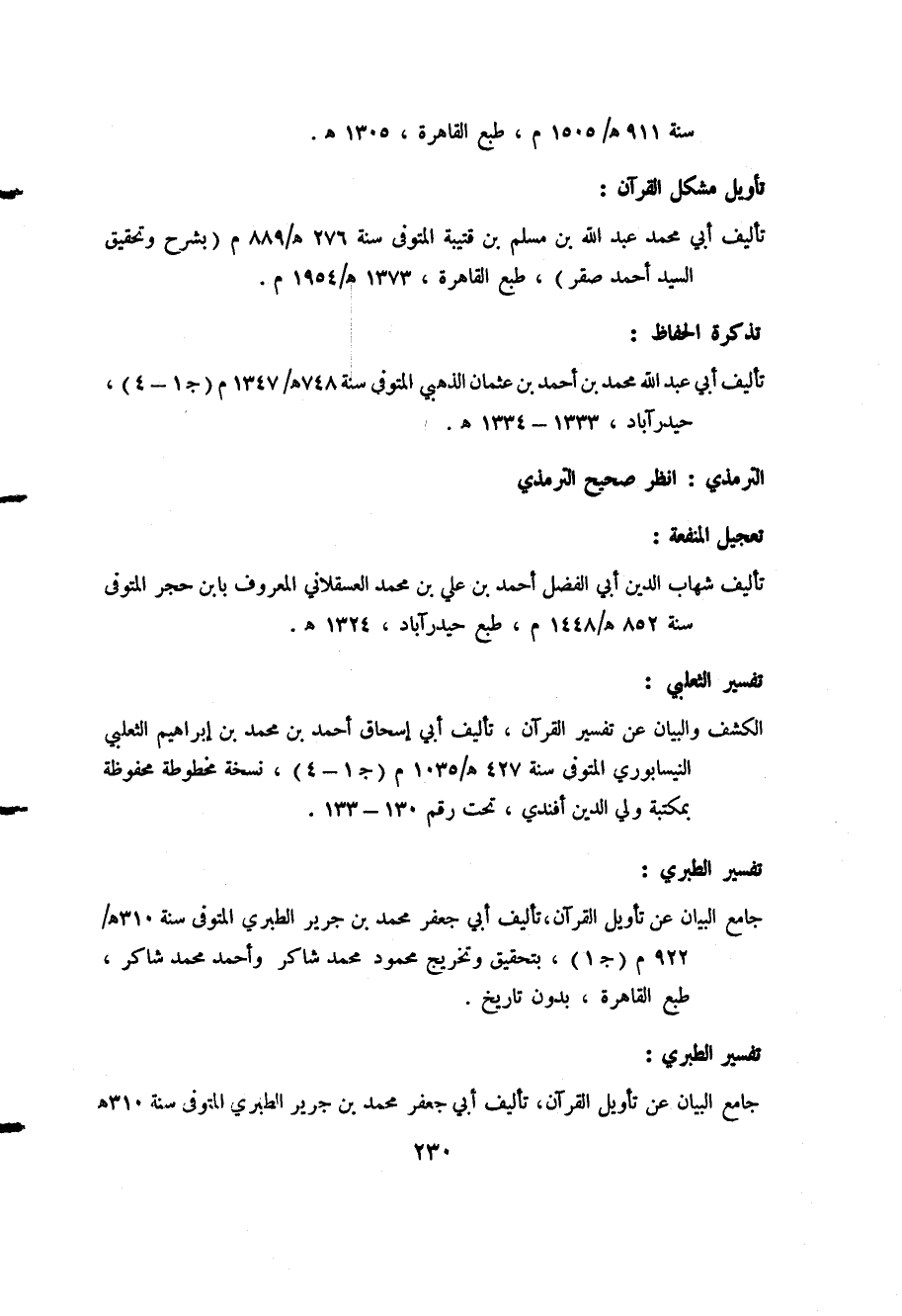 تأليف شهاب الدين أبي الفضل أحمد بن علي بن محمد العسقلاني المعروف بابن حجر المتوفى سنة 852هـ/ 1448م، طبع حيدر آباد، 1324هـ.