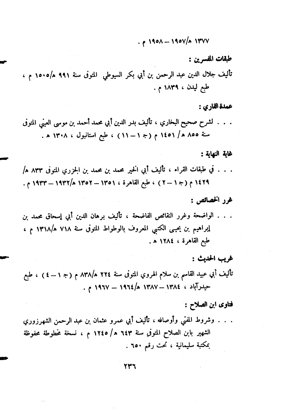 تأليف جلال الدين عبد الرحمن بن أبي بكر السيوطي المتوفى سنة 991هـ/ 1505م، طبع ليدن 1839م.