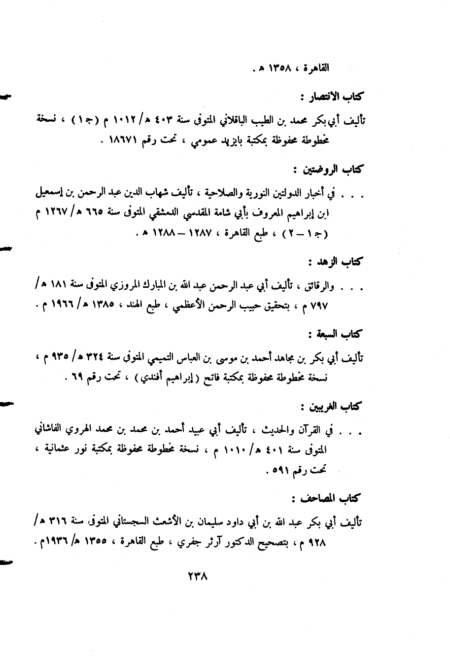 تأليف أبي بكر عبد الله بن أبي داود سليمان بن الأشعث السجستاني المتوفى سنة 316هـ/ 928م، بتصحيح الدكتور آرثر جفري، طبع القاهرة، 1355هـ/ 1936م.