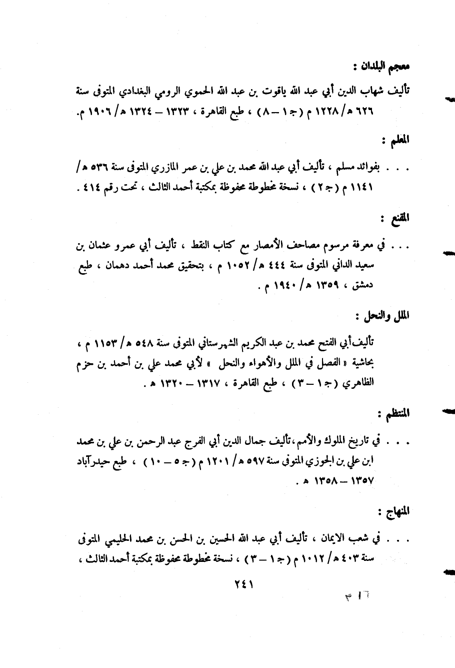 - المنهاج: في شعب الإيمان، تأليف أبي عبد الله الحسين بن الحسن بن محمد الحليمي المتوفى سنة 403هـ/ 1012م "ج1-3"، نسخة مخطوطة محفوظة بمكتبة أحمد الثالث،