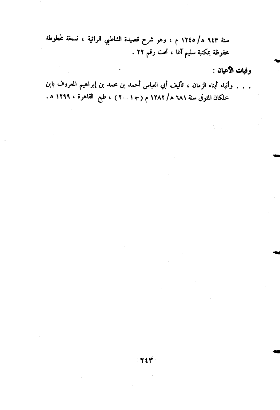 سنة 643هـ/ 1245م، وهو شرح قصيدة الشاطبي الرائية، نسخة مخطوطة محفوظة بمكتبة سليم آغا، تحت رقم 22.