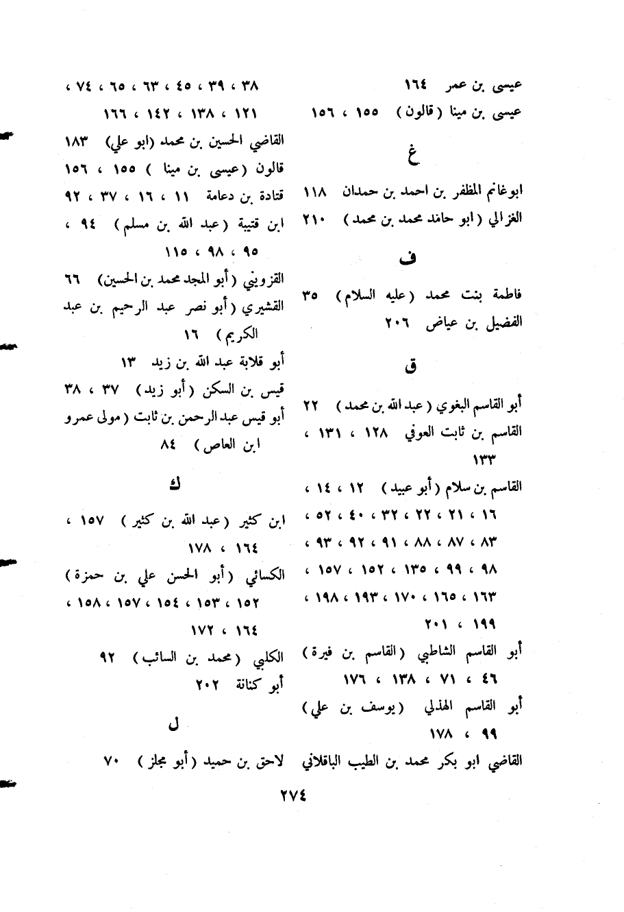 القاسم بن سلام "أبو عبيد" 12، 14، 16، 21، 22، 32، 40، 52، 83، 87، 88، 91، 92، 93، 98، 99، 135، 152، 157، 163، 165، 170، 193، 198، 199، 201