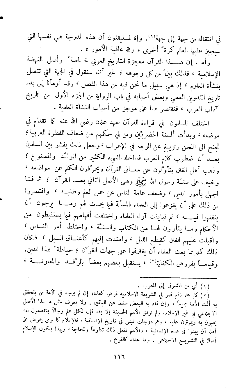 قبيلة في مقدار حميتها وحفاظها ونجدتها، وهذا هو حق الشعور الذي كان يشعر به كل مسلم في السرايا والجيوش التي انصبت على الأمم أول عهدهم بالفتوح، حتى نصروا بالرعب من بعيد وقريب، وكأنما كانت أنفسهم تحارب قبل أجسامهم، وتُعد المراصد لعدوهم من نفسه، وتسلبه ما