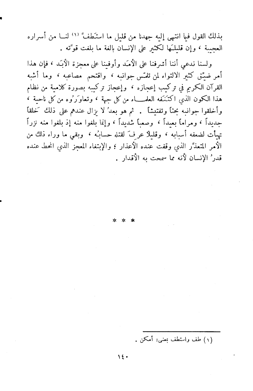 وليس من شيء في أسلوب القرآن ويغُض من موضعه، أو يذهب بطريقته أو يُدخله في شبهٍ من كلام الناس، أو يرده إلى طبع معروف من طباع البلغاء، وما من عالم أو بليغ إلا وهو يعرف