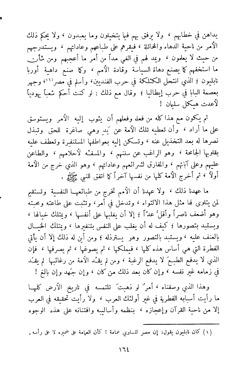 أثر واحد لم يتناوله ناموس النشوء بالنقض من إحدى جهاته على هرم الدهر وتقادمه، غير القرآن فإنه طبقة وحده في إعجاز تركيبه وسلامة معانيه، لم تنقض منه آية ولا كلمة ولا ما دون الكلمة،