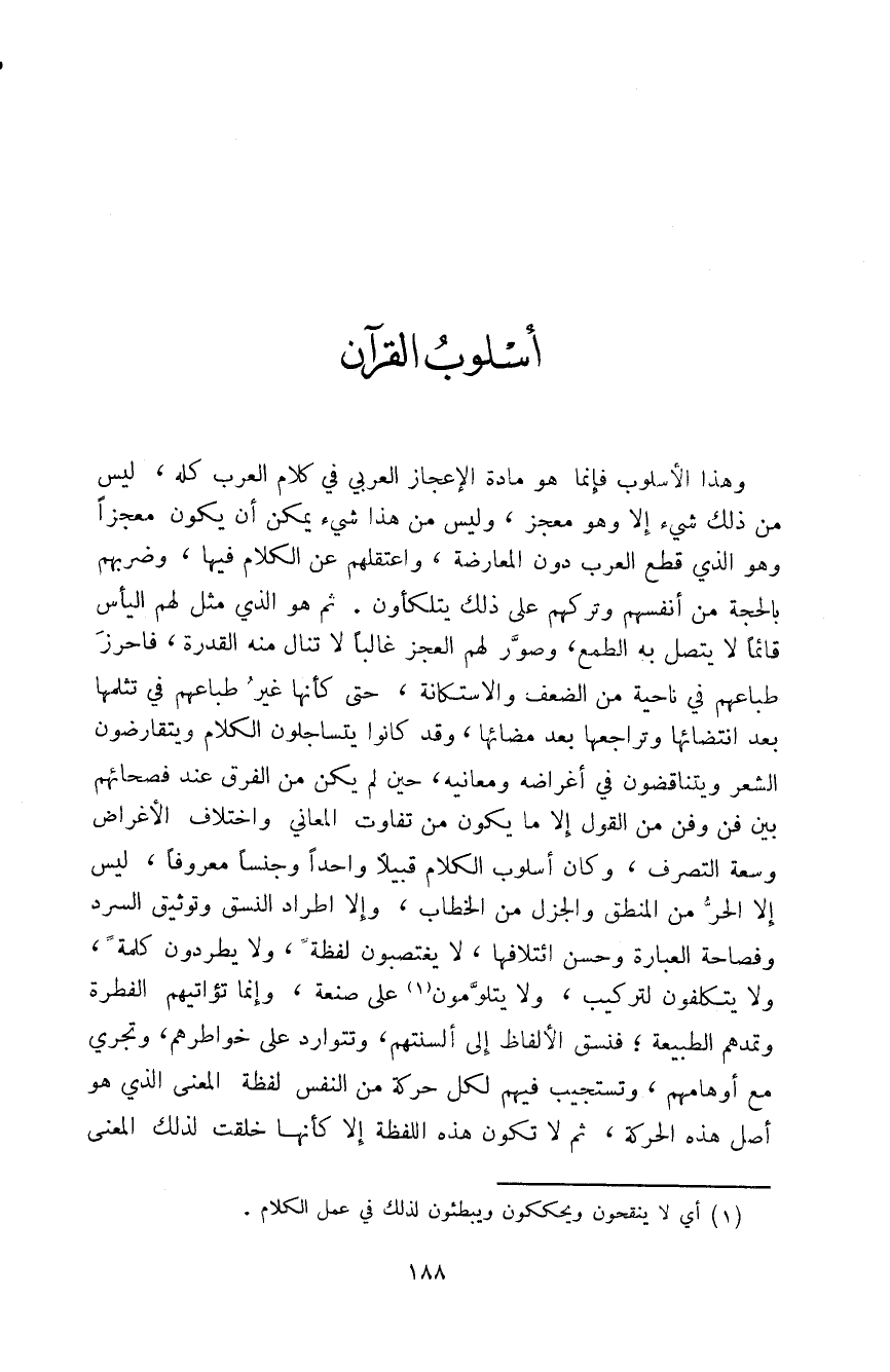 ولو أنعمت على تأمل هذه الجهة لانكشف لك السبب الذي من أجله لا نرى في كل ما يؤثر عن أهل هذه اللغة قولاً معجزاً، ولو اعترضت كثيراً وكثيراً من الجئد الرائع في الكلام، وقرنتَ بعضَه إلى بعض، وبلغت من البيان ما أنت بالغ، لأن كل ذلك ليس من القرآن في نسق ولا طريقة، وإن اتفق له منهما شيء اختلفت عليه منهما أشياء.