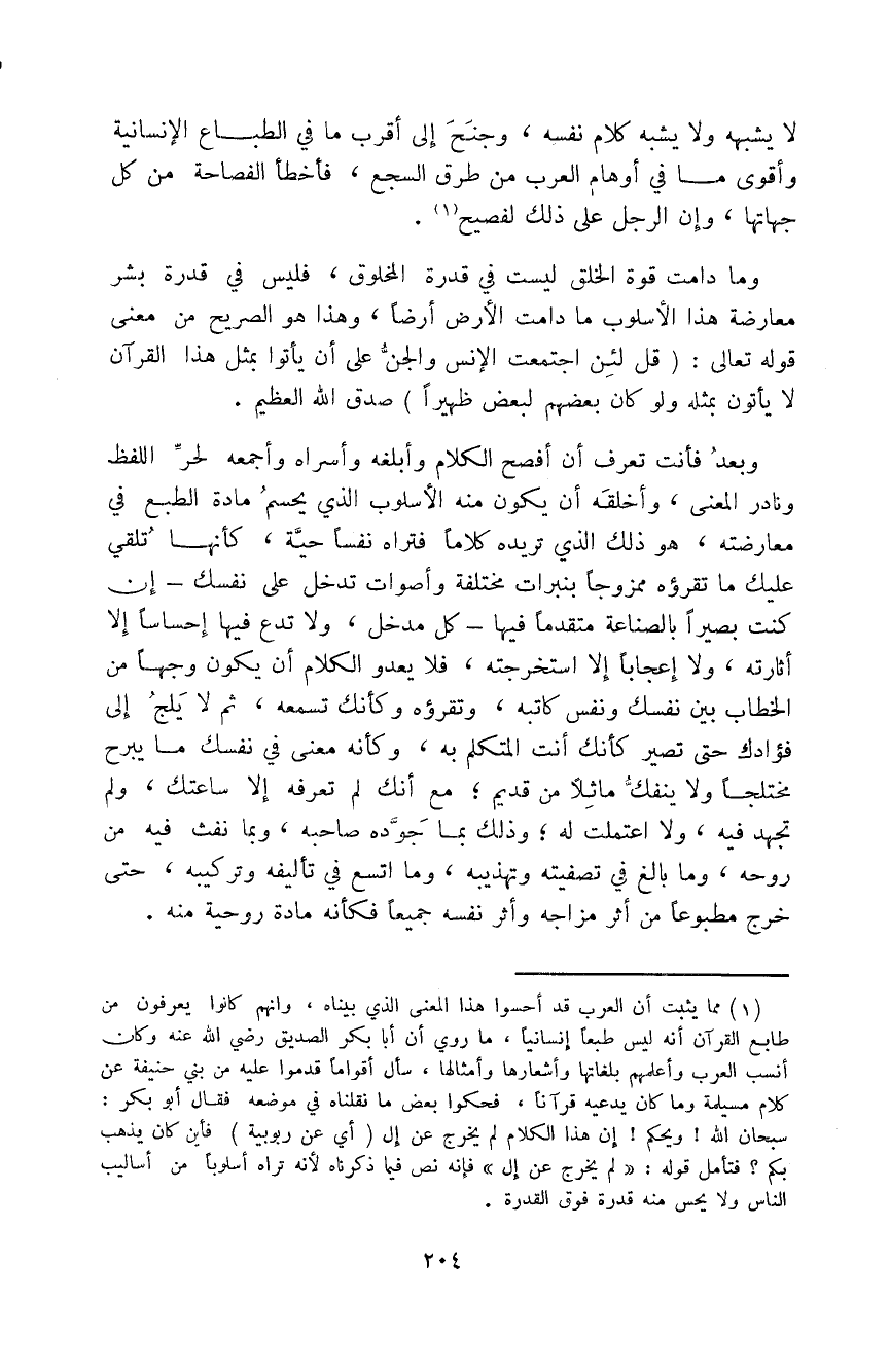 وأحكم، بحيث يخرج كل لفظة وعليها طابعها من النفس - علمت أن هذا المنطق النبوي لا يكون بطبيعة إلا على الوجه الذي بسطناه آنفاً، وأنه بذلك قد جمع خصالاً من إحكام الأداء، لا يشاركه فيها منطق أحد إلى حد، ولا تتوافى إلى غيره ولا تتساوى في سواه.