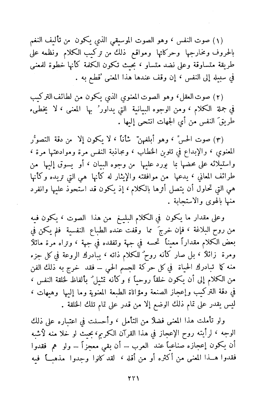 وهذه حقيقة راهنة؛ دليلُها ذلك الكلام نفسهُ بجملته وتفصيله، لا يجهلها إلا جاهل، ولا يغفل عنها إلا غافل، فإذا أنت أضفت إليها ما هناك، من سمو المعنى؛ وفصل الخطاب، وحكمة القول، ودنو المأخذ، وإصابة السر، وفصل التصرف في كل طبقة من الكلام، وما يلتحق بهذه