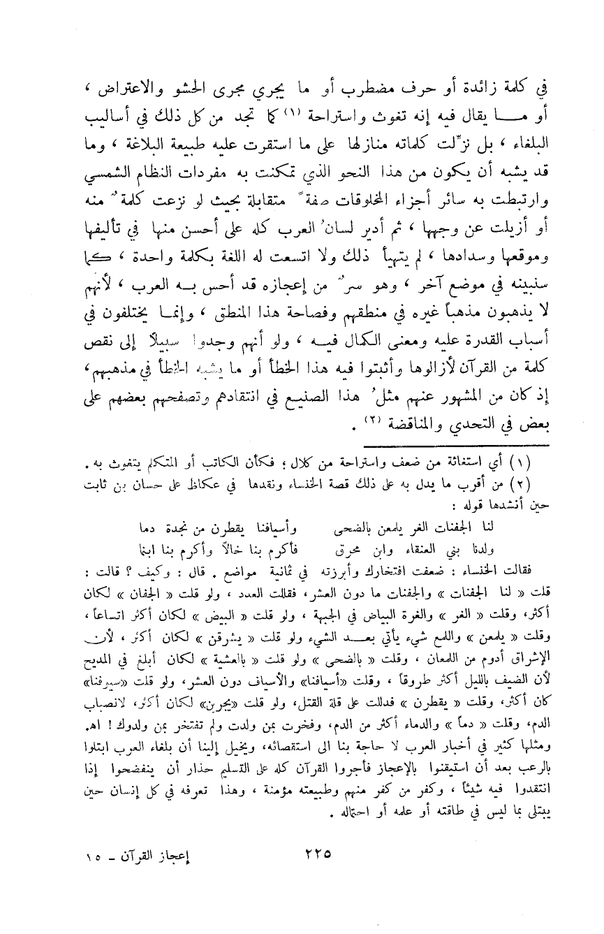 " لو أن رجلاً قرأ على رجل من خطبائهم وبلغائهم - أي العرب - سورة قصيرة أو طويلة، لتبين له في نظامها ومخرجها من لفظها وطابعها، أنه عاجز عن مثلها، ولو تحدى بها أبلغ العرب لأظهر عجزه عنها ".
