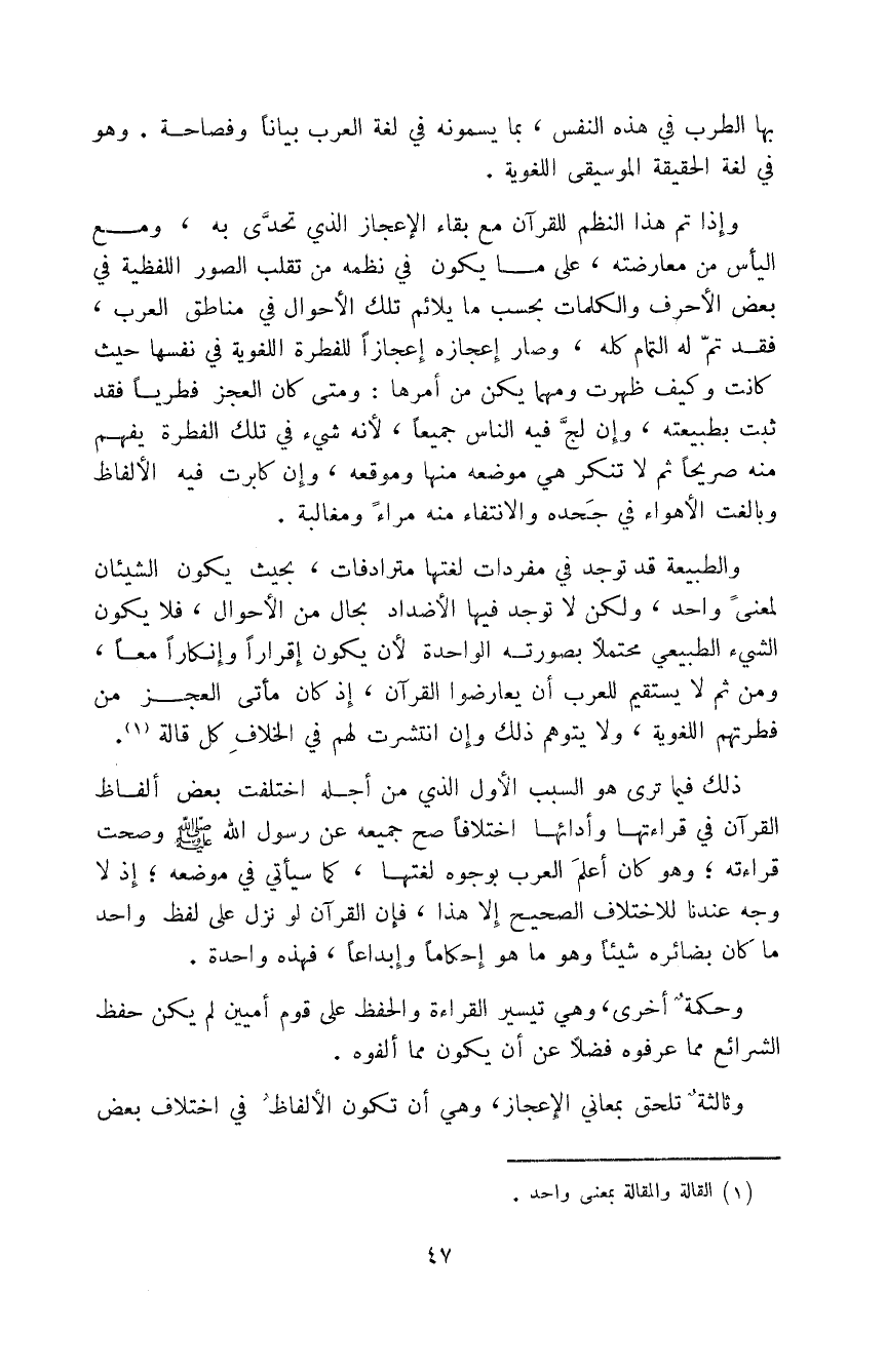 نفسها، لأن التأليف بين المواد المختلفة على وجه متناسب ممكن، ولكن التأليف بينها على وجه يجمعها ويجمع الأذواق المختلفة عليها كما اتفق القرآن، أمرٌ لا يقول بإمكانه من يعرف معنى الإمكان.