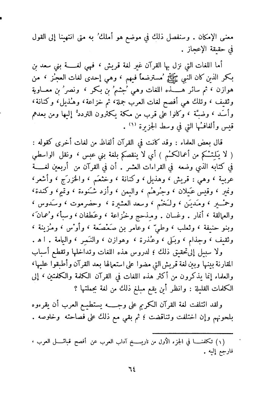 الفصيح مهما ركت ومهما رذلت؛ ولولا القرآن وأنه على وجه واحد وهيئة ثابتة، ما بقيت العرب، ولا تبينت النسبة بين فروعها العامية، بل لذهب كل فرع بما أحدث من الألفاظ، وما استجد من