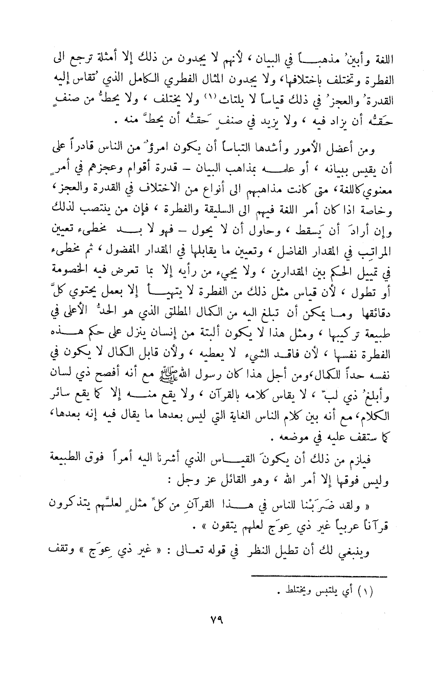 سميناها " الإرادة الاجتماعية " ولو أن العلوم كلها والفلسفة وأهلها كانت لأولئك العرب مكان القرآن لما أغنت شيئاً من غنائه، ولا ردت عليهم بعض مرده؛ فإن الفضيلة العقلية التي أساسها العلم، لا تعطي غير الإرادة النظرية التي ربما اهتدى بها المرء وربما ظل بها على علم، ولكن الفضيلة الأدبية