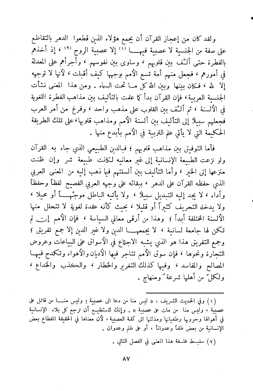 النظرية، إلا أن يجعلوا بينها وبين القرآن نسباً من التأويل والاستشهاد والنظر، أو يبتغوا بها مقصداً ممن مقاصده، أو يريغوا معنى من معاني التفقه في الدين والنظر في آظار الله، إلى ما يشبه ذلك مما يكون في نفسه صلة طبيعية بين أهل العقول والبحث وأهل القلوب والتسليم.