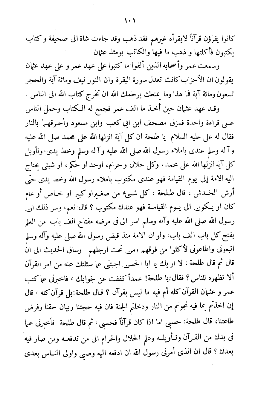 وقد عهد عثمان حين أخذ ما ألف عمر فجمع له الكتاب وحمل الناس على قراءة واحدة فمزق مصحف ابن أبي كعب وابن مسعود وأحرقهما بالنار فقال له عليه السلام يا طلحة إن كل آية أنزلها الله على محمد - صلى الله عليه وسلم - عندي بإملاء رسول الله - صلى الله عليه وسلم - وخط يدي، وتأويل كل آية أنزلها الله على محمد، وكل حلال وحرام، أو حد أو حكم، أو شيء يحتاج إليه الأمة إلى يوم القيامة فهو عندي مكتوب بإملاء رسول الله وخط يدي حتى أرش الخدس، قال طلحة: كل شيء من صغير أو كبير أو خاص أو عام كان أو يكون إلى يوم القيامة فهو عندك مكتوب؟ قال: نعم، وسر ذلك أن رسول الله - صلى الله عليه وسلم - أسر إلي في مرضه مفتاح ألف باب من العلم يفتح كل باب ألف باب، ولو أن الأمة منذ قبض رسول الله - صلى الله عليه وسلم - اتبعوني وأطاعوني لأكلوا من فوقهم ومن تحت أرجلهم وساق الحديث إلى أن قال ثم قال طلحة: لا أريك يا ابن الحسن أجبتني عما سألتك عنه من أمر القرآن ألا تظهره للناس؟ فقال: يا طلحة! عمداً كففت عن جوابك، فأخبرني عما كتب عمر وعثمان القرآن كله أم فيه ما ليس بقرآن؟ قال طلحة: بل قرآن كله، قال إن أخذتم بما فيه نجوتم من النار ودخلتم الجنة فإن فيه حجتنا وبيان حقنا وفرض طاعتنا، قال طلحة: حسبي أما إذا كان قرآناً فحسبي، ثم قال طلحة فأخبرني عما في يدك من القرآن وتأويله وعلم الحلال والحرام إلى من تدفعه ومن صار فيه بعدك؟ قال إن الذي أمرني رسول الله أن أدفعه إليه وصيي وأولى الناس بعدي