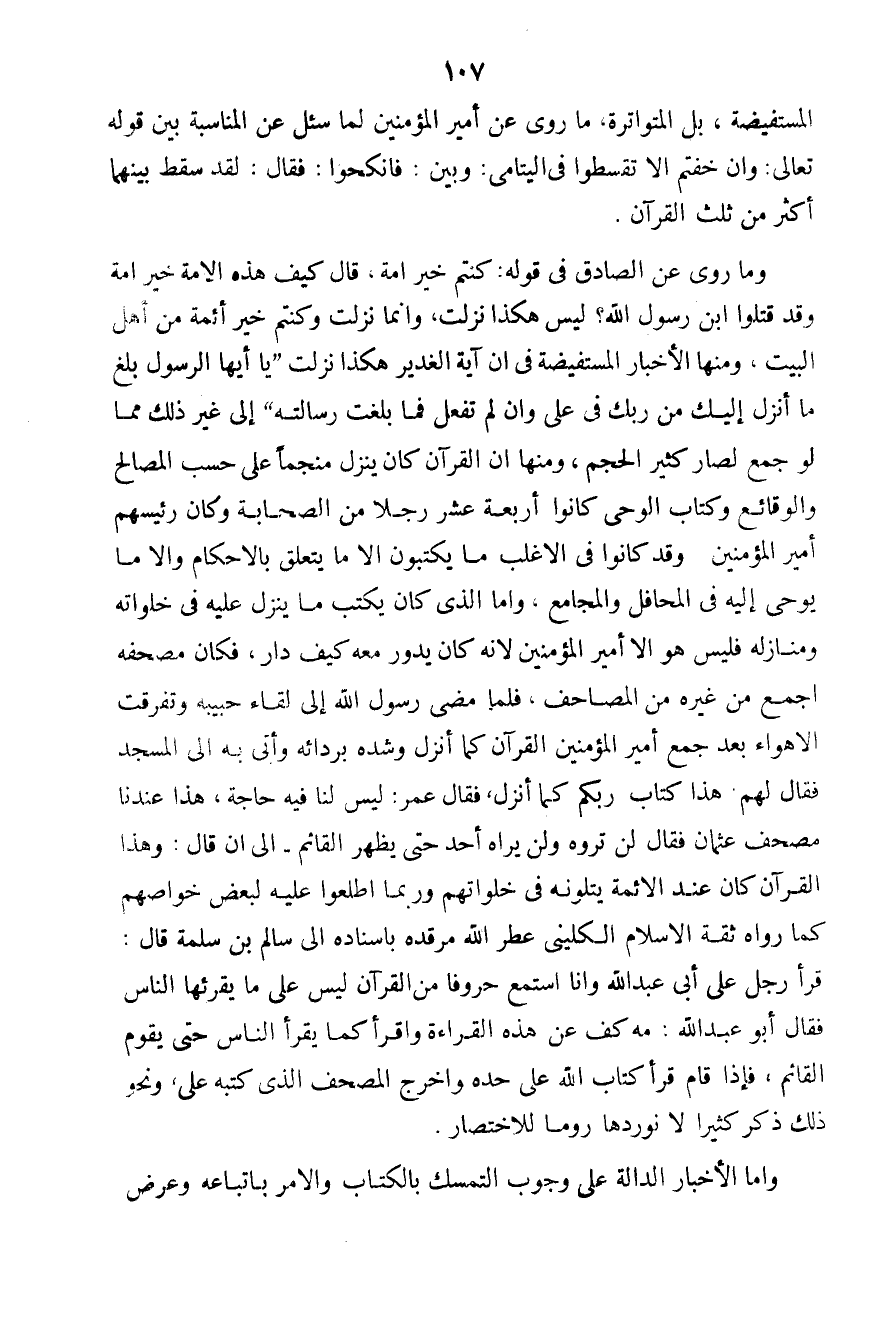 وما روي عن الصادق في قوله: كنتم خير أمة، قال كيف هذه الأمة خير أمة وقد قتلوا ابن رسول الله؟ ليس هكذا نزلت، وإنما نزلت وكنتم خير أئمة من أهل البيت، ومنها الأخبار المستفيضة في أن آية الغدير هكذا نزلت "يا أيها الرسول بلغ ما أنزل إليك من ربك في علي وإن لم تفعل فما بلغت رسالته" إلى غير ذلك مما لو جمع لصار كثير الحجم، ومنها أن القرآن كان ينزل منجماً على حسب المصالح والوقائع وكتاب الوحي كانوا أربعة عشر رجلاً من الصحابة وكان رئيسهم أمير المؤمنين. وقد كانوا في الأغلب ما يكتبون إلا ما يتعلق بالأحكام وإلا ما يوحى إليه في المحافل والمجامع، وأما الذي كان يكتب ما ينزل عليه في خلواته ومنازله فليس هو إلا أمير المؤمنين لأنه كان يدور معه كيف دار، فكان مصحفه أجمع من غيره من المصاحف، فلما مضى رسول الله إلى لقاء حبيبه وتفرقت الأهواء بعد جمع أمير المؤمنين القرآن كما أنزل وشده بردائه وأنى به إلى المسجد فقال لهم هذا كتاب ربكم كما أنزل، فقال عمر: ليس لنا فيه حاجة، هذا عندنا مصحف عثمان فقال لن تروه ولن يراه أحد حتى يظهر القائم - إلى أن قال: وهذا القرآن كان عند الأئمة يتلونه في خلواتهم وربما أطلعوا عليه لبعض خواصهم كما رواه ثقة الإسلام الكليني عطر الله مرقده بإسناده إلى سالم بن سلمة قال: قرأ رجل على أبي عبد الله وأنا أستمع حروفاً من القرآن ليس على ما يقرئها الناس فقال أبو عبد الله: مه كف عن هذه القراءة واقرأ كما يقرأ الناس حتى يقوم القائم، فإذا قام قرأ كتاب الله على حده وأخرج المصحف الذي كتبه على، ونحون ذلك ذكر كثيراً لا نوردها روماً للاختصار.