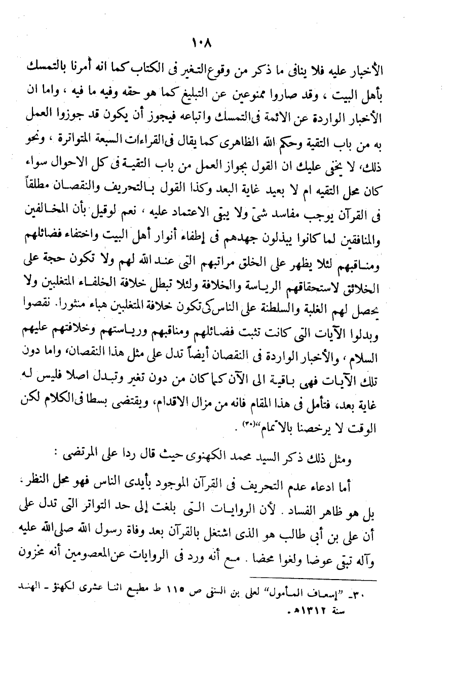 أما ادعاء عدم التحريف في القرآن الموجود بأيدي الناس فهو محل النظر، بل هو ظاهر الفساد. لأن الروايات التي بلغت إلى حد التواتر التي تدل على أن علي بن أبي طالب هو الذي اشتغل بالقرآن بعد وفاة رسول الله - صلى الله عليه وسلم - تبقى عوضاً ولغواً محضاً. مع أنه ورد في الروايات عن المعصومين أنه مخزون