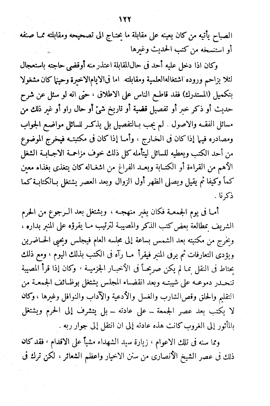 أما في يوم الجمعة فكان يغير منهجه، ويشتغل بعد الرجوع من الحرم الشريف بمطالعة بعض كتب الذكر والمصيبة لترتيب ما يقرؤه على المنبر بداره، ويخرج من مكتبته بعد الشمس بساعة إلى مجلسه العام فيجلس ويحيي الحاضرين ويؤدي التعارفات ثم يرقى المنبر فيقرأ ما رآه في الكتب بذلك اليوم، ومع ذلك يحتاط في النقل بما لم يكن صريحاً في الأخبار الجزمية، وكان إذا قرأ المصيبة تنحدر دموعه على شيبته وبعد انقضاء المجلس يشتغل بوظائف الجمعة من التقليم والحلق وقص الشارب والغسل والأدعية والآداب والنوافل وغيرها، وكان لا يكتب بعد عصر الجمعة - على عادته - بل يتشرف إلى الحرم ويشتغل بالمأثور إلى الغروب كانت هذه عادته إلى أن انتقل إلى جوار ربه.