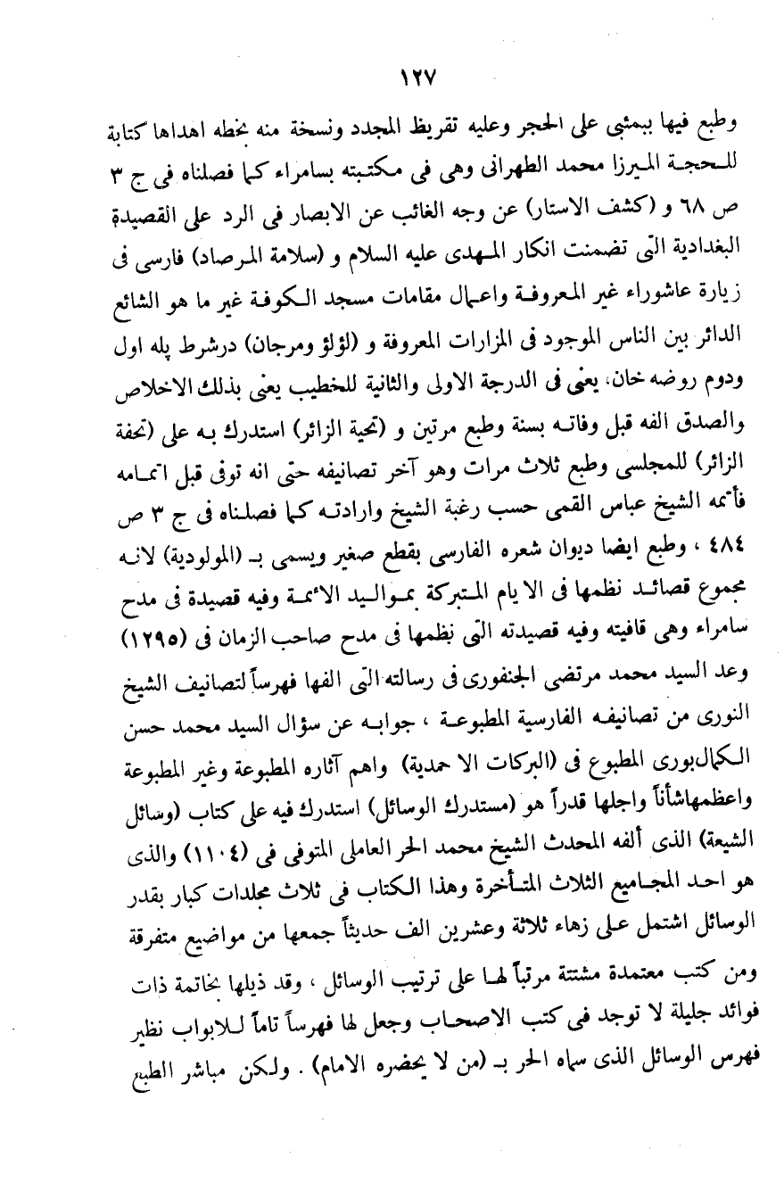 وطبع فيها بمئبى على الحجر وعليه تقريظ المجدد ونسخة منه بخطه أهداها كتابة للحجة الميرزا محمد الطهراني وهي في مكتبته بسامراء كما فصلناه في ج3 ص68 و (كشف الأستار) عن وجه الغائب عن الإبصار في الرد على القصيدة البغدادية التي تضمنت إنكار المهدي عليه السلام و (سلامة المرصاد) فارسي في زيارة عاشوراء غير المعروفة وأعمال مقامات مسجد الكوفة غير ما هو الشائع الدائر بين الناس الموجود في المزارات المعروفة و (لؤلؤ ومرجان) درشرط بله أول ودوم روضه خان، يعني في الدرجة الأولى والثانية للخطيب يعني بذلك الإخلاص والصدق ألفه قبل وفاته بستة وطبع مرتين و (تحية الزائر) استدرك به على (تحفة الزائر) للمجلسي وطبع ثلاث مرات وهو آخر تصانيفه حتى أنه توفي قبل إتمامه فأتمه الشيخ عباس القمي حسب رغبة الشيخ وإرادته كما فصلناه في ج3 ص484، وطبع أيضاً ديوان شعره الفارسي بقطع صغير ويسمى بـ (المولودية) لأنه مجموع قصائد نظمها في الأيام المتبركة بمواليد الأئمة وفيه قصيدة في مد سامراء وهي قافيته وفيه قصيدته التي نظمها في مدح صاحب الزمان في (1295) وعد السيد محمد مرتضى الجنفوري في رسالته التي ألفها فهرساً لتصانيف الشيخ النوري من تصانيفه الفارسية المطبوعة، جوابه عن سؤال السيد محمد حسن الكمال بوري المطبوع في (البركات الأحمدية) وأهم آثاره المطبوعة وغير المطبوعة وأعظمها شأناً وأجلها قدراً هو (مستدرك الوسائل) استدرك فيه على كتاب (وسائل الشيعة) الذي ألفه المحدث الشيخ محمد الحر العاملي المتوفي في (1104) والذي هو أحد المجاميع الثلاث المتأخرة وهذا الكتاب في ثلاث مجلدات كبار بقدر الوسائل اشتمل على زهاء ثلاثة وعشرين ألف حديثاً جمعها من مواضيع متفرقة ومن كتب معتمدة مشتتة مرتباً لها على ترتيب الوسائل، وقد ذيلها بخاتمة ذات فوائد جليلة لا توجد في كتب الأصحاب وجعل لها فهرساً تاماً للأبواب نظير فهرس الوسائل الذي سماه الحر بـ (من لا يحضره الإمام).