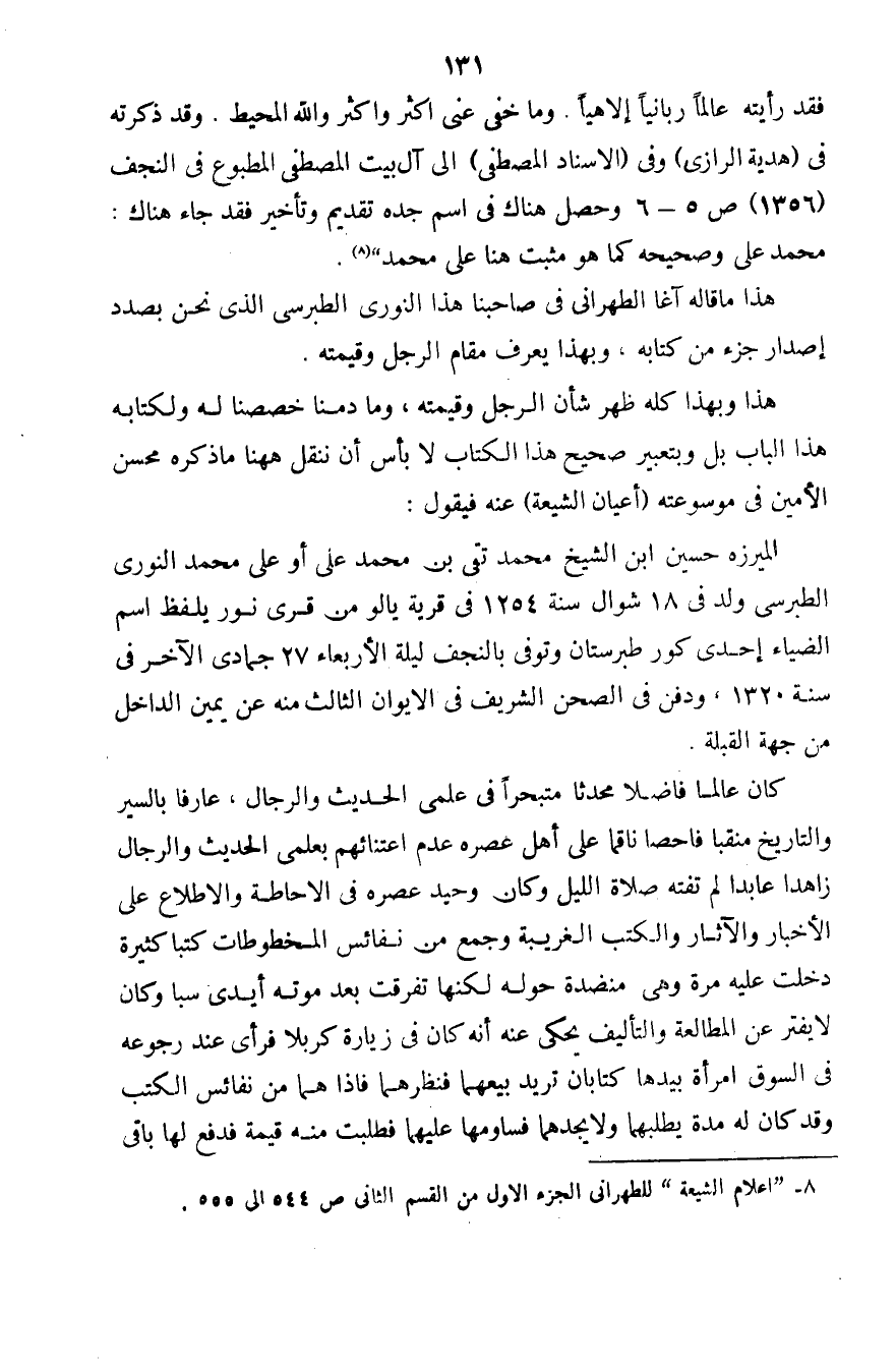 هذا ما قاله آغا الظهراني في صاحبنا هذا النوري الطبرسي الذي نحن بصدد إصدار جزء من كتابه، وبهذا يعرف مقام الرجل وقيمته.