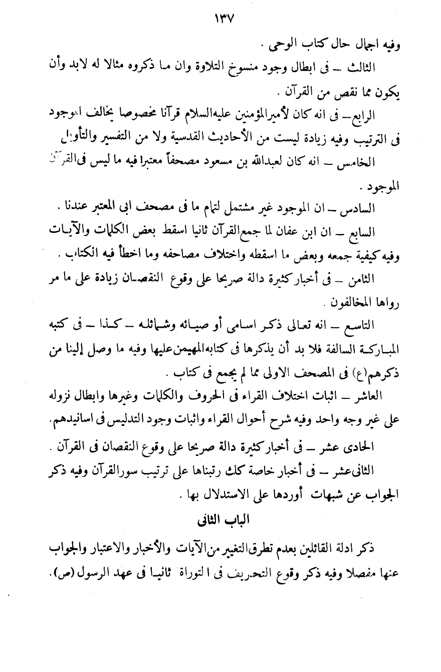 ذكر أدلة القائلين بعدم تطرق التغيير من الآيات والأخبار والاعتبار والجواب عنها مفصلاً وفيه ذكر وقوع التحريف في التوراة ثانياً في عهد الرسول (ص).