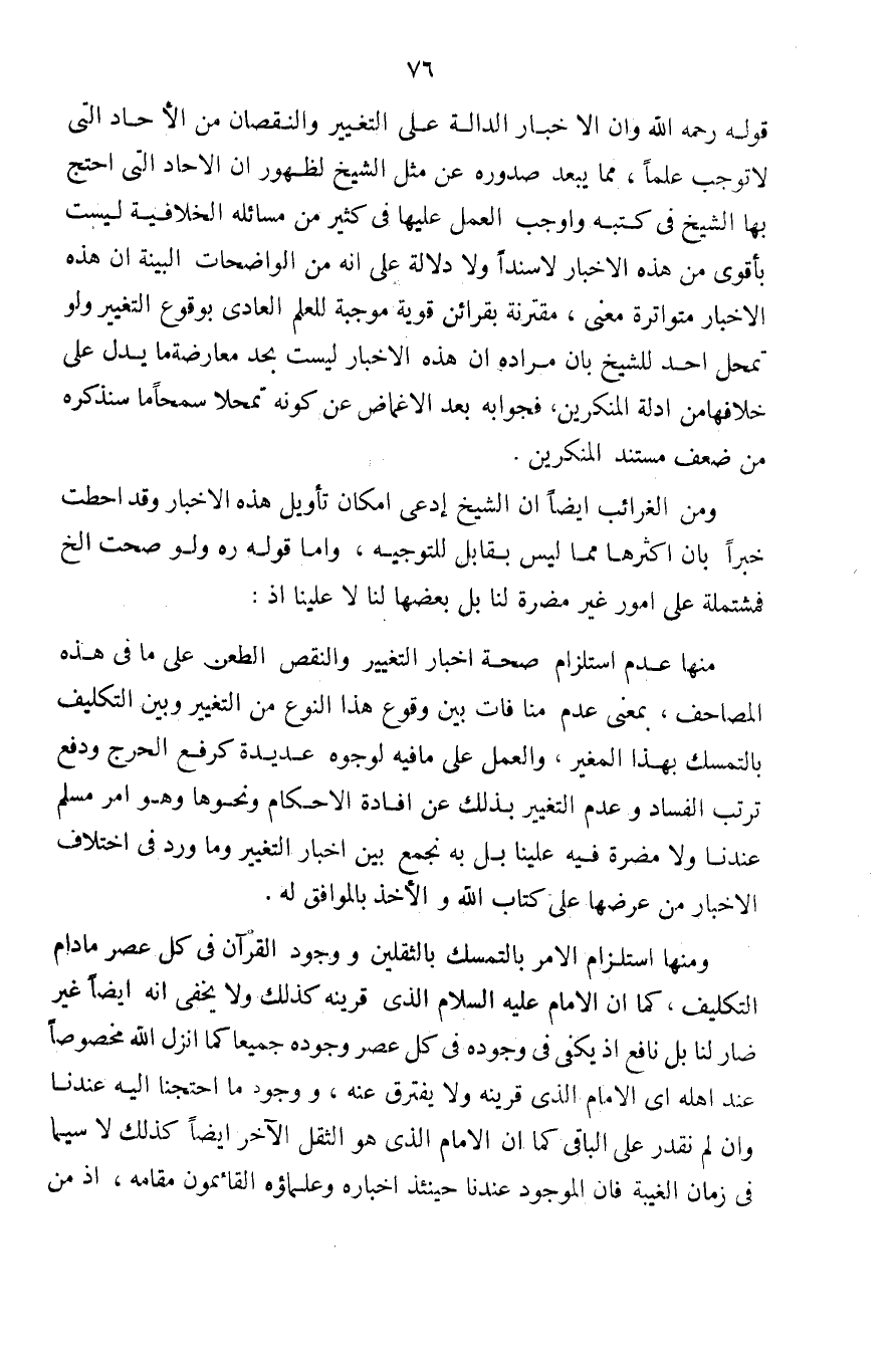 قوله رحمه الله وأن الأخبار الدالة على التغيير والنقصان من الأحاد التي لا توجب علماً، مما يبعد صدوره عن مثل الشيخ لظهور أن الآحاد التي احتج بها الشيخ في كتبه وأوجب العمل عليها في كثير من مسائله الخلافية ليست بأقوى من هذه الأخبار لا سنداً ولا دلالة على أنه من الواضحات البينة أن هذه الأخبار متواترة معنى، مقترنة بقرائن قوية موجبة للعلم العادي بوقوع التغيير ولو تمحل أحد للشيخ بأن مراده أن هذه الأخبار ليست بحد معارضة ما يدل على خلافها من أدلة المنكرين، فجوابه بعد الإغماض عن كونه تمحلاً سمحاً ما سنذكره من ضعف مستند المنكرين.