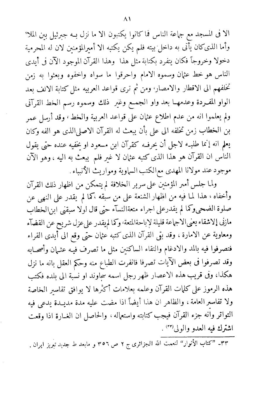 إلا في المسجد مع جماعة الناس فما كانوا يكتبون إلا ما نزل به جبرئيل بين الملأ وأما الذي كان يأتي به داخل بيته فلم يكن يكتبه إلا أمير المؤمنين لأن له المحرمية دخولاً وخروجاً فكان يتفرد بكتابة مثل هذا وهذا القرآن الموجود الآن في أيدي الناس هو خط عثمان وسموه الإمام وأحرقوا ما سواه وأخفوه وبعثوا به زمن تخلفهم إلى الأقطار والأمصار، ومن ثم ترى قواعد العربية مثل كتابة الألف بعد الواو المفردة وعدمها بعد واو الجمع وغير ذلك وسموه رسم الخط القرآني ولم يعلموا أنه من عدم اطلاع عثمان على قواعد العربية والخط، وقد أرسل عمر بن الخطاب زمن خلافته إلى علي بأن يبعث له القرآن الأصلي الذي هو ألفه وكان يعلم أنه إنما طلبه لأجل أن يحرفه كقرآن ابن مسعود أو يخفيه عنده حتى يقول الناس أن القرآن هو هذا الذي كتبه عثمان لا غير فلم يبعث به إليه، وهو الآن موجود عند مولانا المهدي مع الكتب السماوية ومواريث الأنبياء.