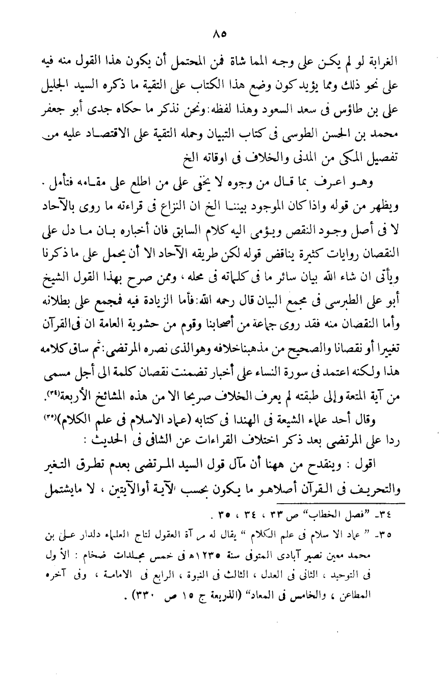 وقال أحد علماء الشيعة في الهند في كتابه (عماد الإسلام في علم الكلام) (¬2) رداً على المرتضى بعد ذكر اختلاف القراءات عن الشافي في الحديث: