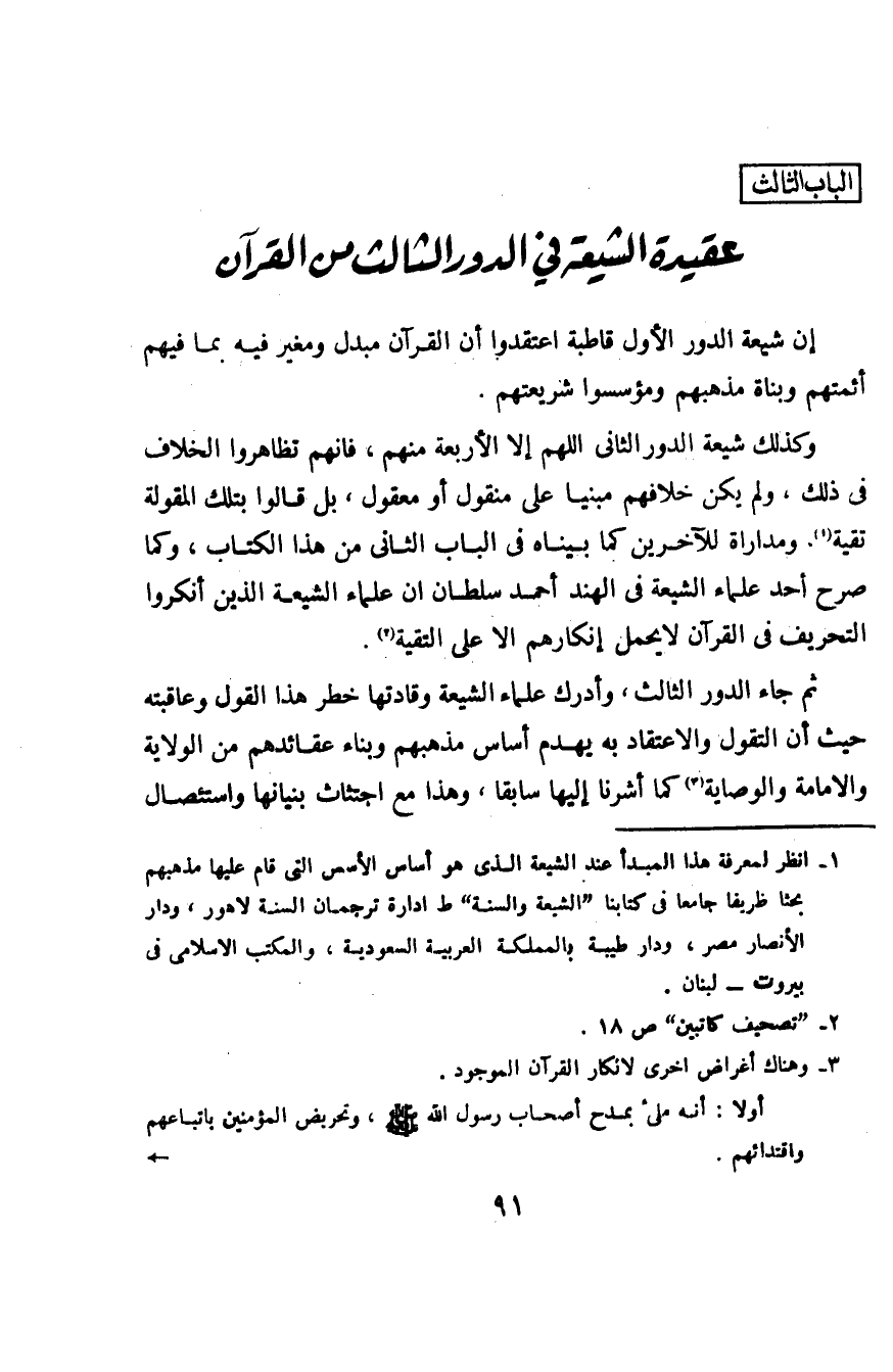 وكذلك شيعة الدور الثاني اللهم إلا الأربعة منهم، فإنهم تظاهروا الخلاف في ذلك، ولم يكن خلافهم مبنياً على منقول أو معقول، بل قالوا بتلك المقولة تقية (¬1). ومداراة للآخرين كما بيناه في الباب الثاني من هذا الكتاب، وكما صرح أحد علماء الشيعة في الهند أحمد سلطان أن علماء الشيعة الذين أنكروا التحريف في القرآن لا يحمل إنكارهم إلا على التقية (¬2).