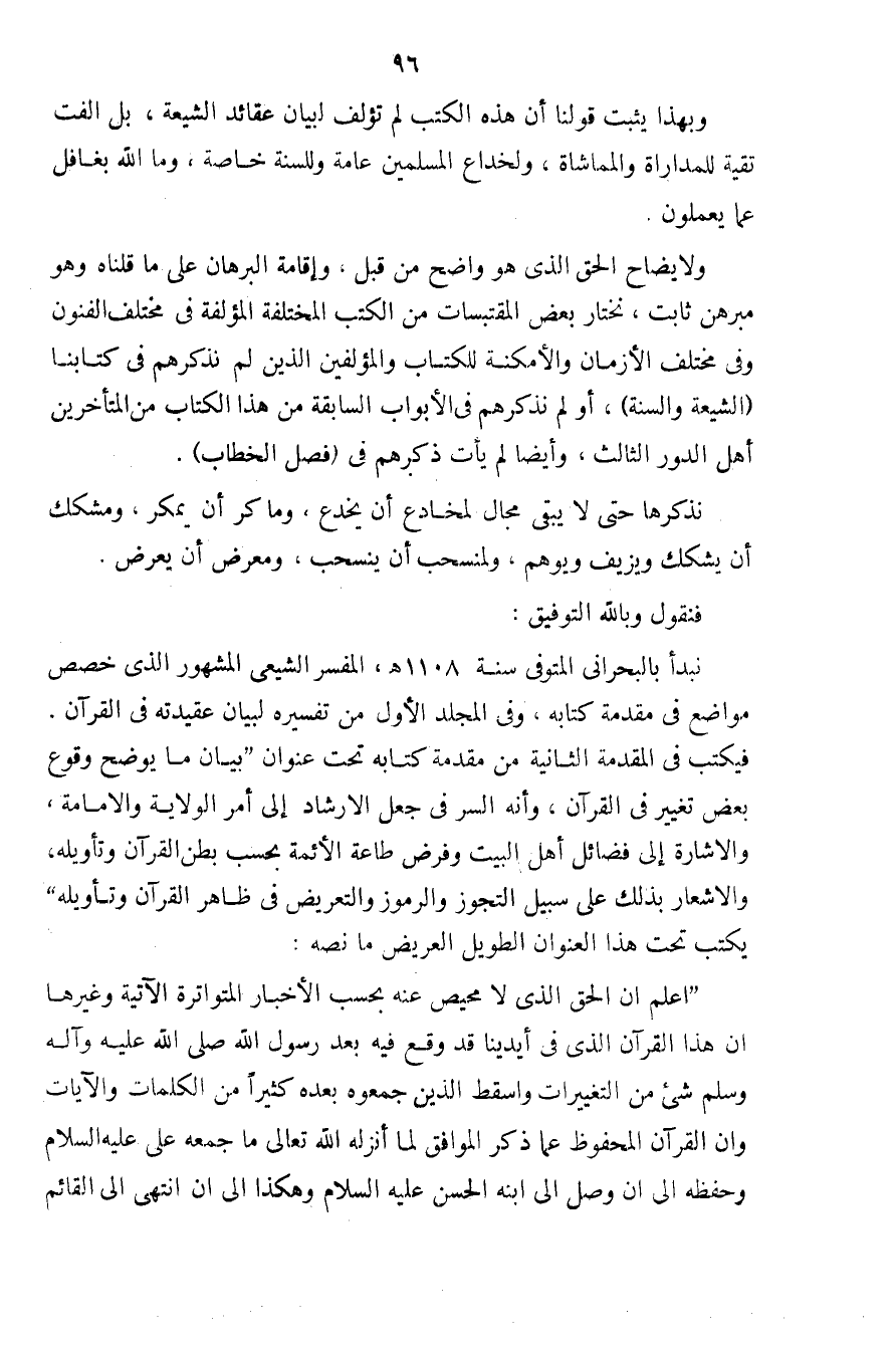 نبدأ بالبحراني المتوفى سنة 1108هـ، المفسر الشيعي المشهور الذي خصص مواضع في مقدمة كتابه، وفي المجلد الأول من تفسيره لبيان عقيدته في القرآن. فيكتب في المقدمة الثانية من مقدمة كتابه تحت عنوان "بيان ما يوضح وقوع بعض تغيير في القرآن، وأنه السر في جعل الإرشاد إلى أمر الولاية والإمامة، والإشارة إلى فضائل أهل البيت وفرض طاعة الأئمة بحسب بطن القرآن وتأويله، والإشعار بذلك على سبيل التجوز والرموز والتعريض في ظاهر القرآن وتأويله" يكتب تحت هذا العنوان الطويل العريض ما نصه: