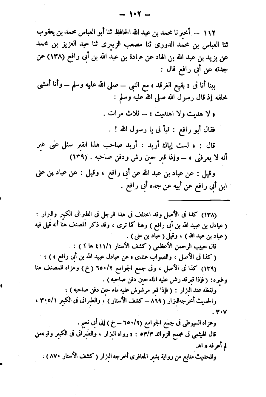 112 - (99) أَخْبَرَنَا مُحَمَّدُ بْنُ عَبْدِ اللَّهِ الْحَافِظُ، ثَنَا أَبُو الْعَبَّاسِ مُحَمَّدُ بْنُ يَعْقُوبَ، ثَنَا الْعَبَّاسُ بْنُ مُحَمَّدٍ الدُّورِيُّ، ثَنَا مُصْعَبٌ الزُّبَيْرِيُّ، ثَنَا عَبْدُ الْعَزِيزِ بْنُ مُحَمَّدٍ، عَنْ يَزِيدَ بْنِ عَبْدِ اللَّهِ بْنِ الْهَادِ، عَنْ عُبَادَةَ بْنِ عَبْدِ اللَّهِ بْنِ أَبِي رَافِعٍ، عَنْ جَدَّتِهِ، عَنْ أَبِي رَافِعٍ قَالَ: بَيْنَا أَنَا فِي بَقِيعِ الْغَرْقَدِ مَعَ النَّبِيِّ صَلَّى اللهُ عَلَيْهِ وَسَلَّمَ وَأَنَا أَمْشِي خَلْفَهُ، إِذْ قَالَ رَسُولُ اللَّهِ صَلَّى اللهُ عَلَيْهِ وَسَلَّمَ: «لَا هُدِيتَ وَلَا اهْتَدَيْتَ» ثَلَاثَ مَرَّاتٍ فَقَالَ أَبُو رَافِعٍ: تَبًّا لِي يَا رَسُولَ اللَّهِ؟ قَالَ: «لَسْتُ إِيَّاكَ أُرِيدُ، أُرِيدُ صَاحِبَ هَذَا الْقَبْرِ سْئَلُ عَنِّي غَيْرَ أَنَّهُ لَا يَعْرِفُنِي» وَإِذَا قَبْرٌ حين رُشَّ ودُفِنَ صَاحِبُهُ.