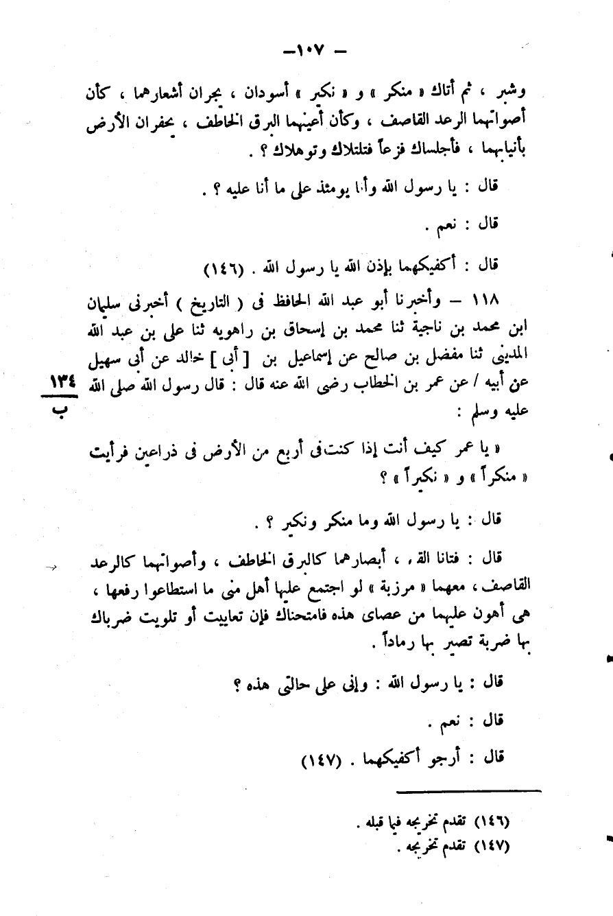118 - (105) وَأَخْبَرَنَا أَبُو عَبْدِ اللَّهِ الْحَافِظُ، فِي التَّارِيخِ، أَخْبَرَنِي سُلَيْمَانُ بْنُ مُحَمَّدِ بْنِ نَاجِيَةَ، ثَنَا مُحَمَّدُ بْنُ إِسْحَاقَ بْنِ رَاهَوَيْهِ، ثَنَا عَلِيُّ بْنُ عَبْدِ اللَّهِ الْمَدِينِيُّ، ثَنَا مُفَضَّلُ بْنُ صَالِحٍ، عَنْ إِسْمَاعِيلَ بْنِ أَبِي خَالِدٍ، عَنْ أَبِي سُهَيْلٍ، عَنْ أَبِيهِ، عَنْ عُمَرَ بْنِ الْخَطَّابِ رَضِيَ اللَّهُ عَنْهُ قَالَ: قَالَ رَسُولُ اللَّهِ صَلَّى اللهُ عَلَيْهِ وَسَلَّم: «يَا عُمَرُ كَيْفَ أَنْتَ إِذَا كُنْتَ فِي أَرْبَعٍ مِنَ الْأَرْضِ فِي ذِرَاعَيْنِ، فَرَأَيْتَ مُنْكَرًا وَنَكِيرًا؟» قَالَ: يَا رَسُولَ اللَّهِ وَمَا مُنْكَرٌ وَنَكِيرٌ؟ قَالَ: «فَتَّانَا الْقَبْرِ أَبْصَارُهُمَا كَالْبَرْقِ الْخَاطِفِ وَأَصْوَاتُهُمَا كَالرَّعْدِ الْقَاصِفِ، مَعَهُمَا مِرْزَبَّةٌ لَوِ اجْتَمَعَ عَلَيْهَا أَهْلُ مِنًى مَا اسْتَطَاعُوا رَفْعَهَا، هِيَ أَهْوَنُ عَلَيْهَمَا مِنْ عَصَايَ هَذِهِ، فَامْتَحَنَاكَ، فَإِنْ تَعَايَيْتَ أَوْ تَلَوَّيْتَ ضَرَبَاكَ بِهَا ضَرْبَةً تَصِيرُ بِهَا رَمَادًا» قَالَ: يَا رَسُولَ اللَّهِ، وَإِنِّي عَلَى حَالَتِي هَذِهِ؟ قَالَ: «نَعَمْ» قَالَ: أَرْجُو أَكْفِيكَهُمَا