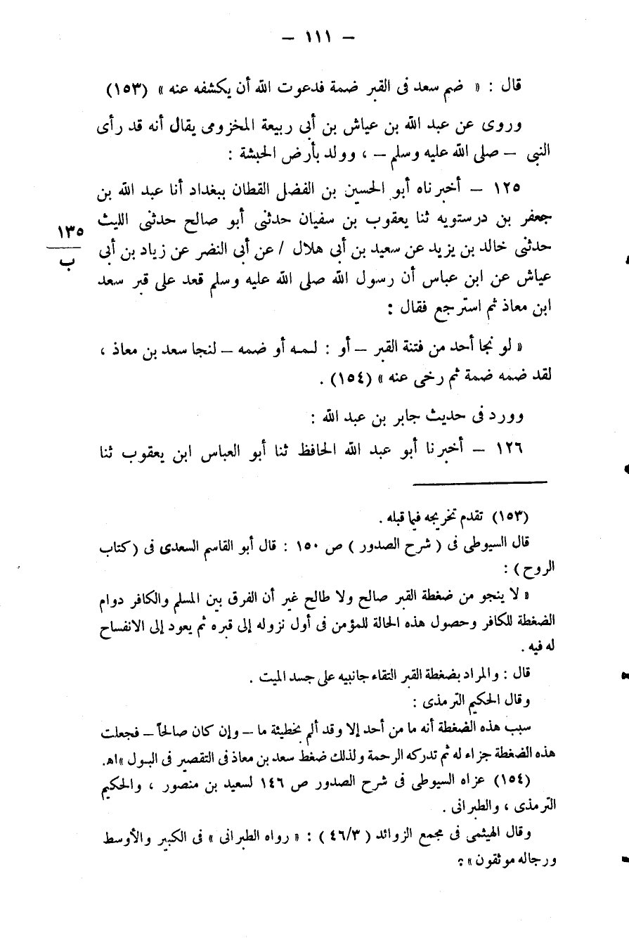 125 - (112) أَخْبَرَنَاهُ أَبُو الْحُسَيْنِ بْنُ الْفَضْلِ الْقَطَّانُ، بِبَغْدَادَ، أَنَا عَبْدُ اللَّهِ بْنُ جَعْفَرِ بْنِ دَرَسْتَوَيْهِ، ثَنَا يَعْقُوبُ بْنُ سُفْيَانَ، حَدَّثَنِي أَبُو صَالِحٍ، حَدَّثَنِي اللَّيْثُ، حَدَّثَنِي خَالِدُ بْنُ يَزِيدَ، عَنْ سَعِيدِ بْنِ أَبِي هِلَالٍ، عَنْ أَبِي النَّضْرِ، عَنْ زِيَادِ بْنِ أَبِي عَيَّاشٍ، عَنِ ابْنِ عَبَّاسٍ أَنَّ رَسُولَ اللَّهِ صَلَّى اللهُ عَلَيْهِ وَسَلَّم قَعَدَ عَلَى قَبْرِ سَعْدِ بْنِ مُعَاذٍ ثُمَّ اسْتَرْجَعَ فَقَالَ: «لَوْ نَجَا أَحَدٌ مِنْ فِتْنَةِ الْقَبْرِ، أَوْ لَمِّهِ أَوْ ضَمِّهِ، لَنَجَا سَعْدُ بْنُ مُعَاذٍ، لَقَدْ ضَمَّهُ ضَمَّةً ثُمَّ رُخِّيَ عَنْهُ»