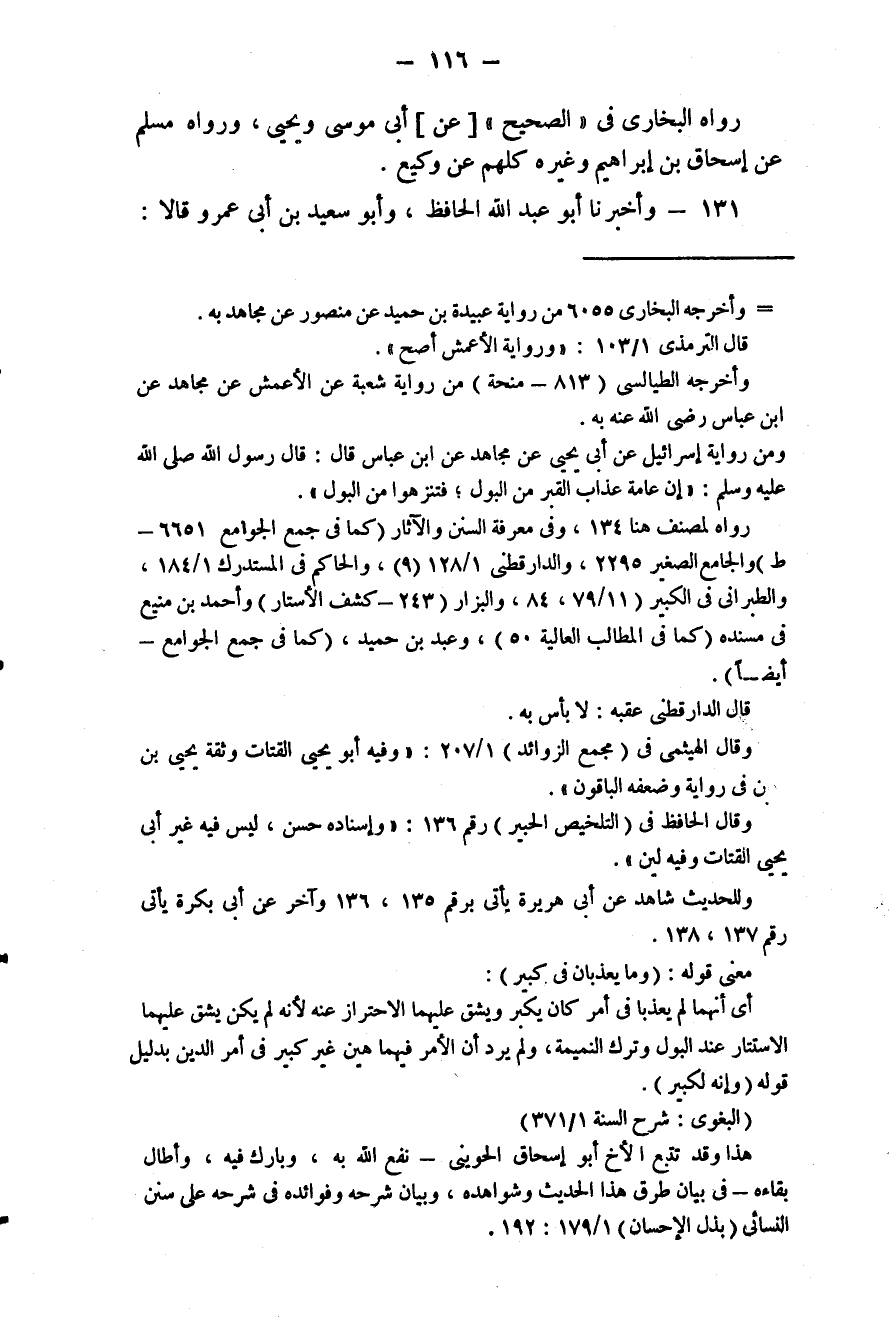 131 - (118) وَأَخْبَرَنَا أَبُو عَبْدِ اللَّهِ الْحَافِظُ، وَأَبُو سَعِيدِ بْنُ أَبِي عَمْرٍو قَالَا: #117# ثَنَا أَبُو الْعَبَّاسِ مُحَمَّدُ بْنُ يَعْقُوبَ، ثَنَا أَحْمَدُ بْنُ عَبْدِ الْجَبَّارِ، ثَنَا أَبُو مُعَاوِيَةَ، عَنِ الْأَعْمَشِ، فَذَكَرَهُ بِإِسْنَادِهِ وَمَعْنَاهُ إِلَّا أَنَّهُ قَالَ فِي الْحَدِيثِ: «وَأَمَا الْآخَرُ فَكَانَ لَا يَسْتَنْزِهُ مِنَ الْبَوْلِ» قَالَ: ثُمَّ أَخَذَ جَرِيدَةً رَطْبَةً فَشَقَّهَا نِصْفَيْنِ ثُمَّ جَعَلَ فِي كُلِّ قَبْرٍ وَاحِدَةً قَالَ: قَالُوا: يَا رَسُولَ اللَّهِ لَمْ فَعَلْتَ هَذَا؟ قَالَ: فَقَالَ: «لَعَلَّهُمَا أَنْ يُخَفِّفَا عَنْهُمَا مَا لَمْ يَيْبَسَا»