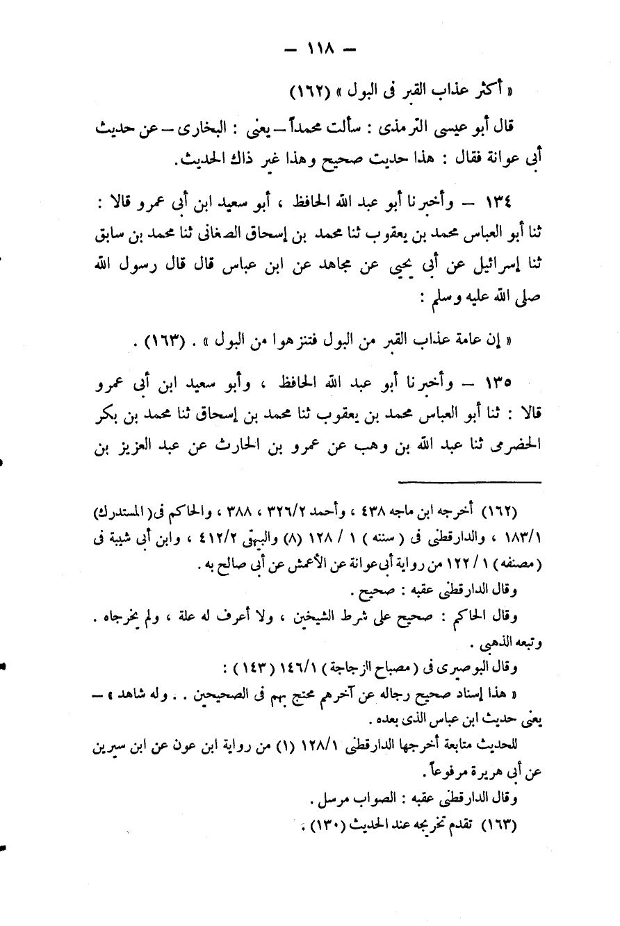 134 - (121) وَأَخْبَرَنَا أَبُو عَبْدِ اللَّهِ الْحَافِظُ، وَأَبُو سَعِيدِ بْنُ أَبِي عَمْرٍو قَالَا: ثَنَا أَبُو الْعَبَّاسِ مُحَمَّدُ بْنُ يَعْقُوبَ، ثَنَا مُحَمَّدُ بْنُ إِسْحَاقَ الصَّغَانِيُّ، ثَنَا مُحَمَّدُ بْنُ سَابِقٍ، ثَنَا إِسْرَائِيلُ، عَنْ أَبِي يَحْيَى، عَنْ مُجَاهِدٍ، عَنِ ابْنِ عَبَّاسٍ قَالَ: قَالَ رَسُولُ اللَّهِ صَلَّى اللهُ عَلَيْهِ وَسَلَّمَ: «إِنَّ عَامَّةَ عَذَابِ الْقَبْرِ مِنَ الْبَوْلِ، فَتَنَزَّهُوا مِنَ الْبَوْلِ»