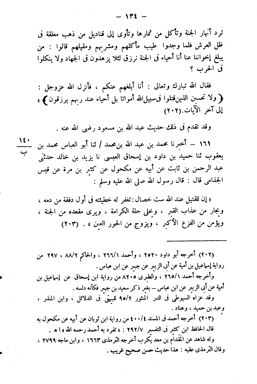 161 - (146) أَخْبَرَنَا مُحَمَّدُ بْنُ عَبْدِ اللَّهِ بْنِ مُحَمَّدٍ، ثَنَا أَبُو الْعَبَّاسِ مُحَمَّدُ بْنُ يَعْقُوبَ، ثَنَا حُمَيْدُ بْنُ دَاوُدَ بْنِ إِسْحَاقَ الْعَبْسِيُّ، نَا يَزِيدُ بْنُ خَالِدٍ، حَدَّثَنِي عَبْدُ الرَّحْمَنِ بْنُ ثَابِتٍ، عَنْ أَبِيهِ، عَنْ مَكْحُولٍ، عَنْ كَثِيرِ بْنِ مُرَّةَ، عَنْ قَيْسٍ الْجُذَامِيِّ قَالَ: قَالَ رَسُولُ اللَّهِ صَلَّى اللهُ عَلَيْهِ وَسَلَّمَ: «إِنَّ لِلْقَتِيلِ عِنْدَ اللَّهِ سِتَّ خِصَالٍ، تُغْفَرُ لَهُ خَطِيئَتُهُ فِي أَوَّلِ دَفْقَةٍ مِنْ دَمِهِ، وَيُجَارُ مِنْ عَذَابِ الْقَبْرِ، وَيُحَلَّى حُلَّةَ الْكَرَامَةِ وَيَرَى مَقْعَدَهُ مِنَ الْجَنَّةِ، وَيُؤَمَّنُ مِنَ الْفَزَعِ الْأَكْبَرِ، وَيُزَوَّجُ مِنَ الْحُورِ الْعَيْنِ»