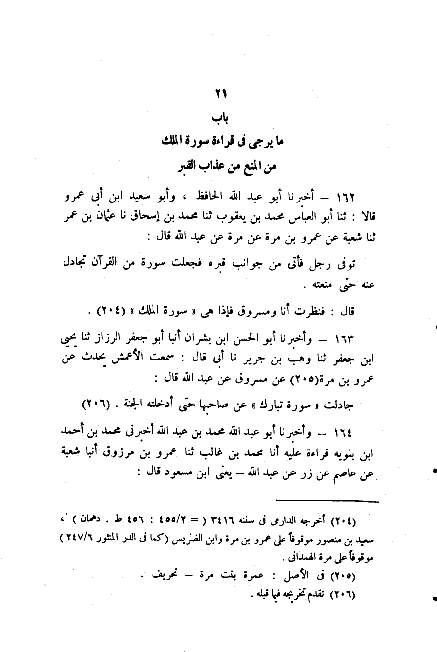 162 - (147) أَخْبَرَنَا أَبُو عَبْدِ اللَّهِ الْحَافِظُ، وَأَبُو سَعِيدِ بْنُ أَبِي عَمْرٍو قَالَا: ثَنَا أَبُو الْعَبَّاسِ مُحَمَّدُ بْنُ يَعْقُوبَ، ثَنَا مُحَمَّدُ بْنُ إِسْحَاقَ، نَا عُثْمَانُ بْنُ عُمَرَ، ثَنَا شُعْبَةُ، عَنْ عَمْرِو بْنِ مُرَّةَ، عَنْ مُرَّةَ، عَنْ عَبْدِ اللَّهِ قَالَ: تُوُفِّيَ رَجُلٌ فَأُتِيَ مِنْ جَوَانِبِ قَبْرِهِ، فَجَعَلَتْ سُورَةٌ مِنَ الْقُرْآنِ تُجَادِلُ عَنْهُ حَتَّى مَنَعَتْهُ قَالَ: فَنَظَرْتُ أَنَا وَمَسْرُوقٌ فَإِذَا هِيَ سُورَةُ الْمُلْكِ "