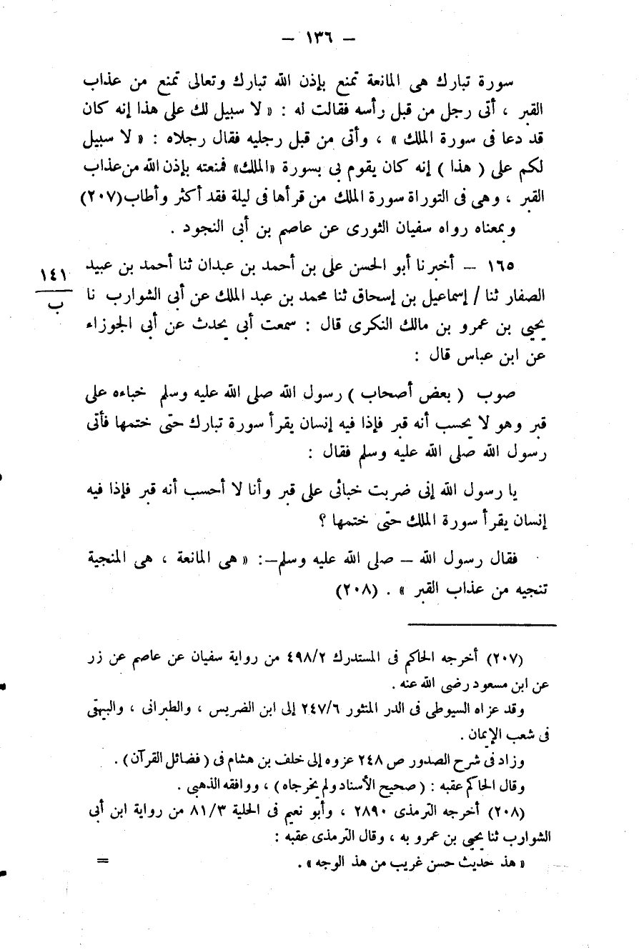 165 - (150) أَخْبَرَنَا أَبُو الْحَسَنِ عَلِيُّ بْنُ أَحْمَدَ بْنِ عَبْدَانَ، ثَنَا أَحْمَدُ بْنُ عُبَيْدٍ الصَّفَّارُ، ثَنَا إِسْمَاعِيلُ بْنُ إِسْحَاقَ، ثَنَا مُحَمَّدُ بْنُ عَبْدِ الْمَلِكِ بْنِ أَبِي الشَّوَارِبِ، نَا يَحْيَى بْنُ عَمْرِو بْنِ مَالِكٍ النُّكْرِيُّ قَالَ: سَمِعْتُ أَبِي يُحَدِّثُ عَنْ أَبِي الْجَوْزَاءِ، عَنِ ابْنِ عَبَّاسِ قَالَ: صَوَّبَ بَعْضُ أَصْحَابِ رَسُولِ اللَّهِ صلى الله عليه وسلم خِبَاءَهُ عَلَى قَبْرٍ وَهُوَ لَا يَحْسَبُ أَنَّهُ قَبْرٌ، فَإِذَا فِيهِ إِنْسَانٌ يَقْرَأُ سُورَةَ تَبَارَكَ حَتَّى خَتَمَهَا، فَأَتَى رَسُولُ اللَّهِ صَلَّى اللهُ عَلَيْهِ وَسَلَّمَ فَقَالَ: يَا رَسُولَ اللَّهِ إِنِّي ضَرَبْتُ خِبَائِي عَلَى قَبْرٍ وَأَنَا لَا أَحْسَبُ أَنَّهُ قَبْرٌ، فَإِذَا فِيهِ إِنْسَانٌ يَقْرَأُ سُورَةَ الْمُلْكِ حَتَّى خَتَمَهَا فَقَالَ رَسُولُ اللَّهِ صَلَّى اللهُ عَلَيْهِ وَسَلَّمَ: «هِيَ الْمَانِعَةُ هِيَ الْمُنْجِيَةُ تُنْجِيهِ مِنْ عَذَابِ الْقَبْرِ»
