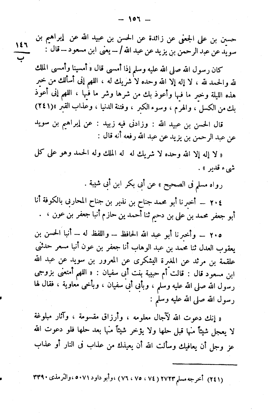 205 - وَأَخْبَرَنَا أَبُو عَبْدِ اللَّهِ الْحَافِظُ، وَاللَّفْظُ لَهُ، أنبا الْحَسَنُ بْنُ يَعْقُوبَ الْعَدْلُ، ثَنَا مُحَمَّدُ بْنُ عَبْدِ الْوَهَّابِ، أَنَا جَعْفَرُ بْنُ عَوْنٍ، أنبا مِسْعَرٌ، حَدَّثَنِي عَلْقَمَةُ بْنُ مَرْثَدٍ، عَنِ الْمُغِيرَةِ الْيَشْكُرِيِّ، عَنِ الْمَعْرُورِ بْنِ سُوَيْدٍ، عَنْ عَبْدِ اللَّهِ بْنِ مَسْعُودٍ قَالَ: قَالَتْ أُمُّ حَبِيبَةَ بِنْتُ أَبِي سُفْيَانَ: اللَّهُمَّ أَمْتِعْنِي بِزَوْجِي رَسُولِ اللَّهِ صَلَّى اللهُ عَلَيْهِ وَسَلَّمَ وَبِأَبِي أَبِي سُفْيَانَ، وَبِأَخِي مُعَاوِيَةَ، فَقَالَ لَهَا رَسُولُ اللَّهِ صَلَّى اللهُ عَلَيْهِ وَسَلَّمَ: «إِنَّكِ دَعَوْتِ اللَّهَ لِآجَالٍ مَعْلُومَةٍ وَأَرْزَاقٍ مَقْسُومَةٍ وَآثَارٍ مَبْلُوغَةٍ، لَا يُعَجَّلُ شَيْءٌ مِنْهَا قَبْلَ حِلِّهَا وَلَا يُؤَخَّرُ شَيْءٌ مِنْهَا بَعْدَ حِلِّهَا، فَلَوْ دَعَوْتِ اللَّهَ عَزَّ وَجَلَّ أَنْ يُعَافِيَكِ وَسَأَلْتِ اللَّهَ أَنْ يُعِيذَكِ مِنْ عَذَابٍ فِي النَّارِ أَوْ عَذَابٍ #157# فِي الْقَبْرِ لَكَانَ خَيْرًا، أَوْ لَكَانَ أَفْضَلَ»
